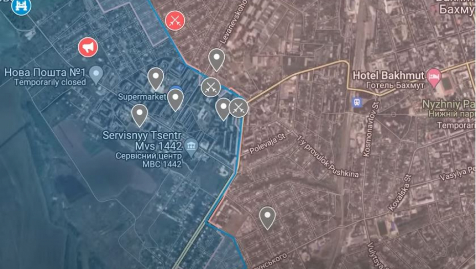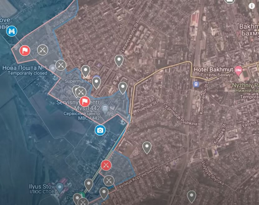 Prema svim podacima koji su bili na raspolaganju, ova mapa najpreciznije objašnjava stanje u Bahmutu do 14. maja.