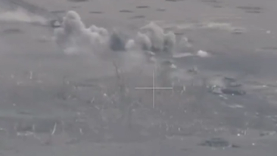 Na snimku je zabeležena serija eksplozija oko kolone dok se vidi i kako se dronovi kamikaze zabijaju u ruska oklopna vozila.