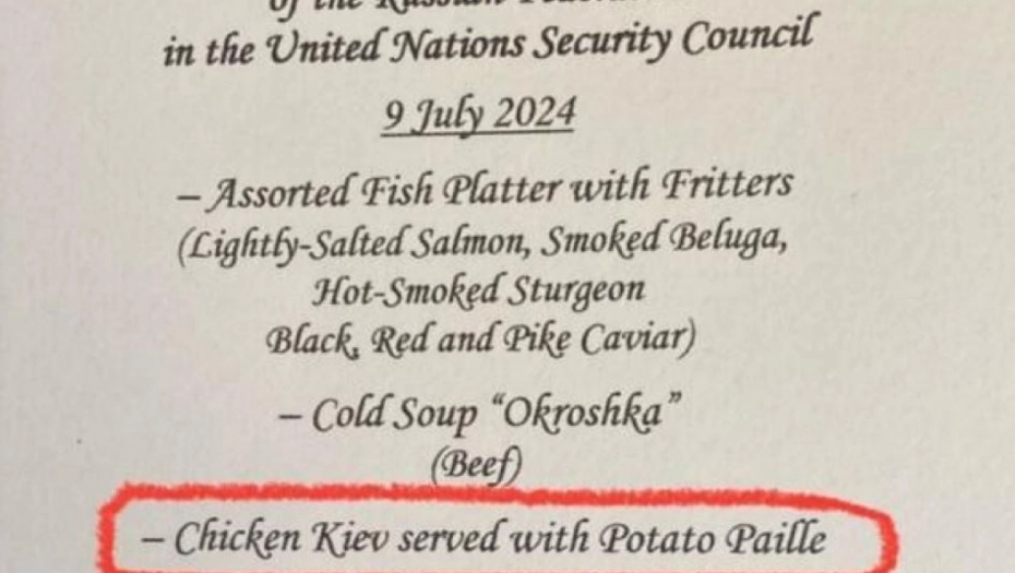 Kijev Indipendent, kao i Anton Geraščenko, savetnik ukrajinskog ministra unutrašnjih poslova, koji redovno objavljuje vesti o ratu u Ukrajini na X-u, izvestili su da je Rusija u utorak bila domaćin ručka povodom ruskog predsedavanja Savetom bezbednosti UN, a da je na meniju, između ostalog, bilo i ukrajinsko jelo "Piletina Kijev".