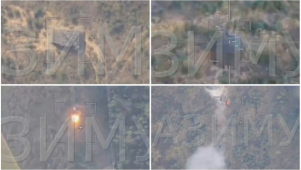 Snimak bez datuma koji je objavilo ministarstvo prikazuje vozilo Malahit postavljeno u šumovitom terenu, u koje je potom direktno pogođen dron.