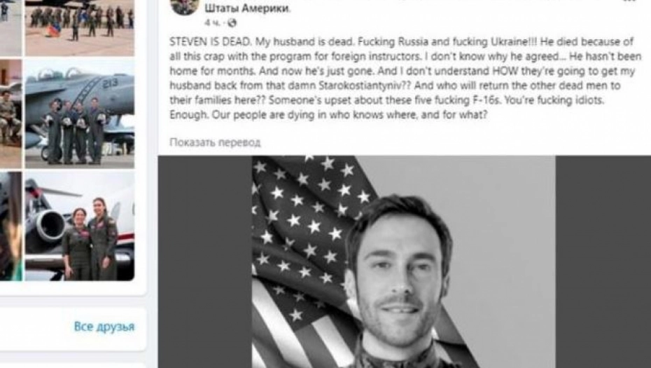“Stiven je mrtav. Moj muž je mrtav […] Umro je zbog celog ovog programa stranih instruktora. Ne znam zašto je pristao. Nije bio kod kuće nekoliko meseci. A sada ga jednostavno nema. I ne razumem kako će da mi vrate muža iz ovog prokletog Starokonstantinova?? A ko će preostale mrtve muškarce vratiti njihovim porodicama ovde? Dosta. Naš narod gine neznano gde i za šta”, glasi emotivni post udovice američkog pilota.