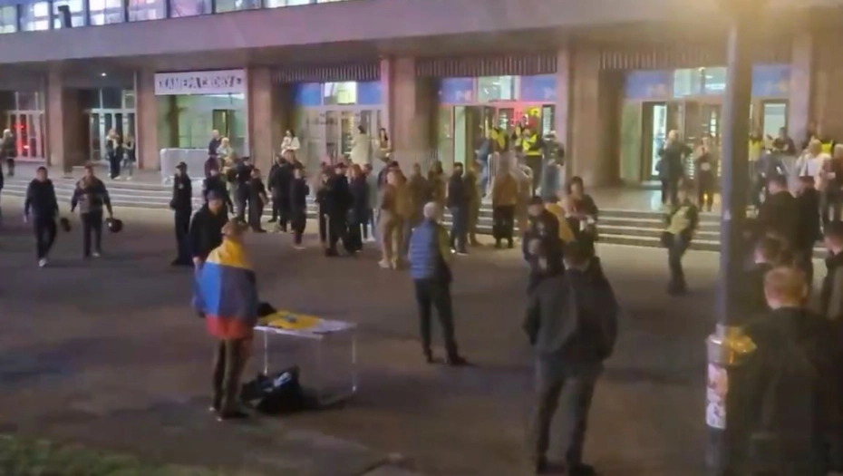 Na video snimku objavljenom na društvenim mrežama vidi se trenutak kada je policija u petak odvukla dvojicu muškaraca iz Hale sportova, gde je svirao ukrajinski rok bend Okean Elzi.