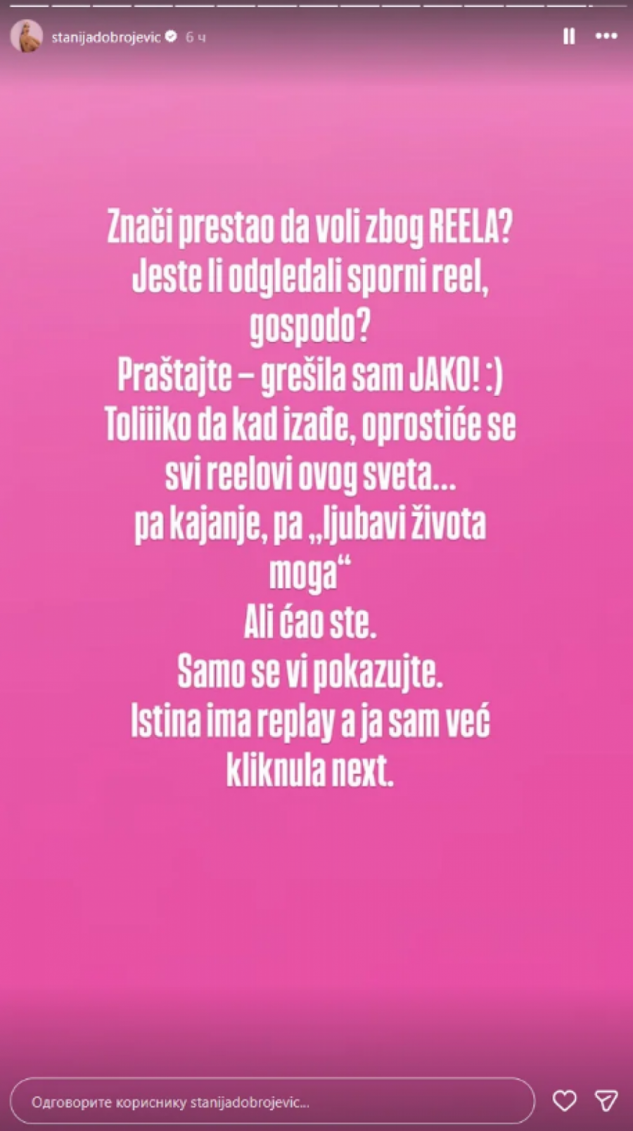 - Znači prestao da voli zbog reel-a? Jeste li odgledali sporni reel, gospodo? Praštajte, grešila sam jako. Toliko, da kad izađe, oprostiće se svi reelovi ovog sveta. Na kajanje, pa "ljubavi života moga", ali ćao ste. Samo se vi pokazujte. Istina ima replay , a ja sam već kliknula next - navela je ona.