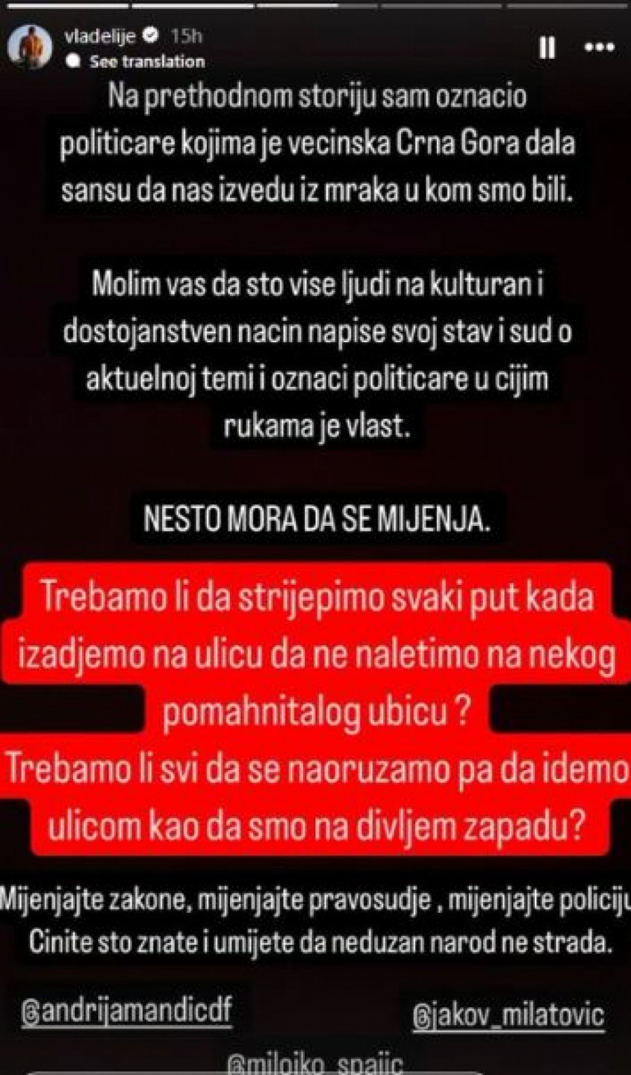 Vladimir Tomović objavio je nekoliko storija na kojima je izrazio veliki bes zbog tragedije koja se desila 1. januara na Cetinju.