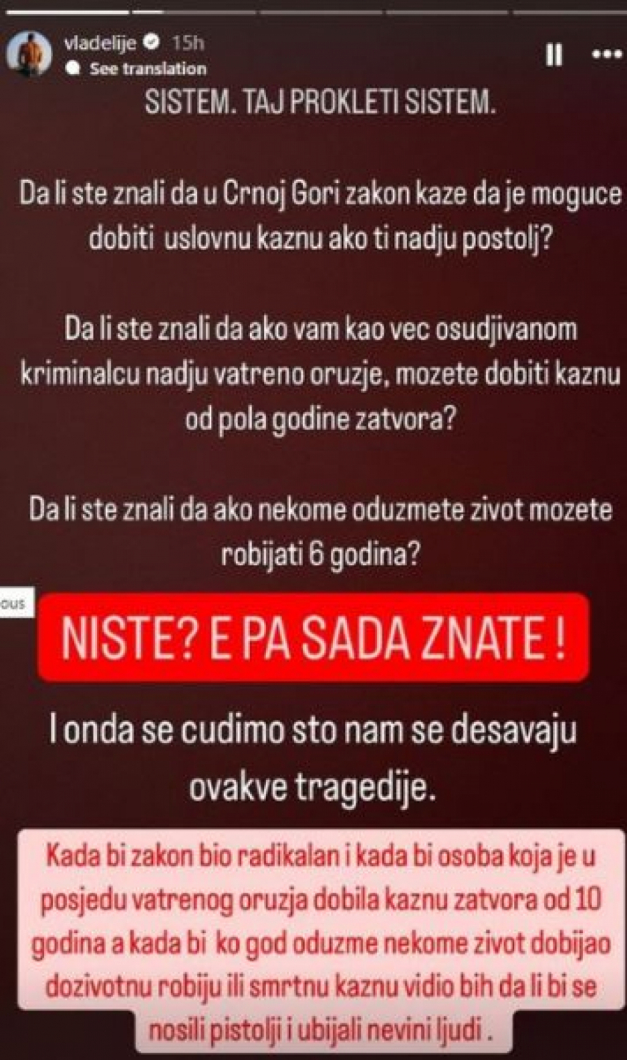 - Kad bi zakon bio radikalniji i kad bi osoba koja ima u posedu vatreno oružje dobila kaznu zatvora od 10 godina, a kad bi ko god oduzme nekome život dobijao doživotnu robiju ili smrtnu kaznu, video bih da li bi se nosili pištolji i ubijali nevini ljudi - napisao je Vladimir.
