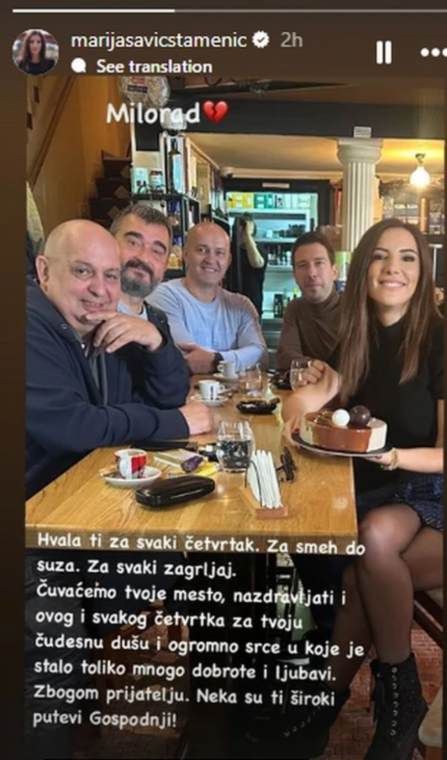 - Čuvaćemo tvoje mesto, nazdravljati i ovog i svakog četvrtka za tvoju čudesnu dušu i ogromno srce u koje je stalo toliko mnogo dobrote i ljubavi. Zbogom, prijatelju, nek su ti široki putevi gospodnji - poručila je voditeljka.