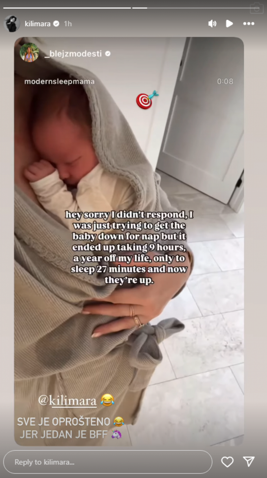 - Hej, izvini što nisam odgovorila, pokušavala sam samo da uspavam bebu, što mi je na kraju oduzelo 9 sati, godinu života, da bi spavala 27 minuta i sad je budna - pisalo je u objavi koju je Anđela objavila na svom Instagram profilu i označila Kilibardu.