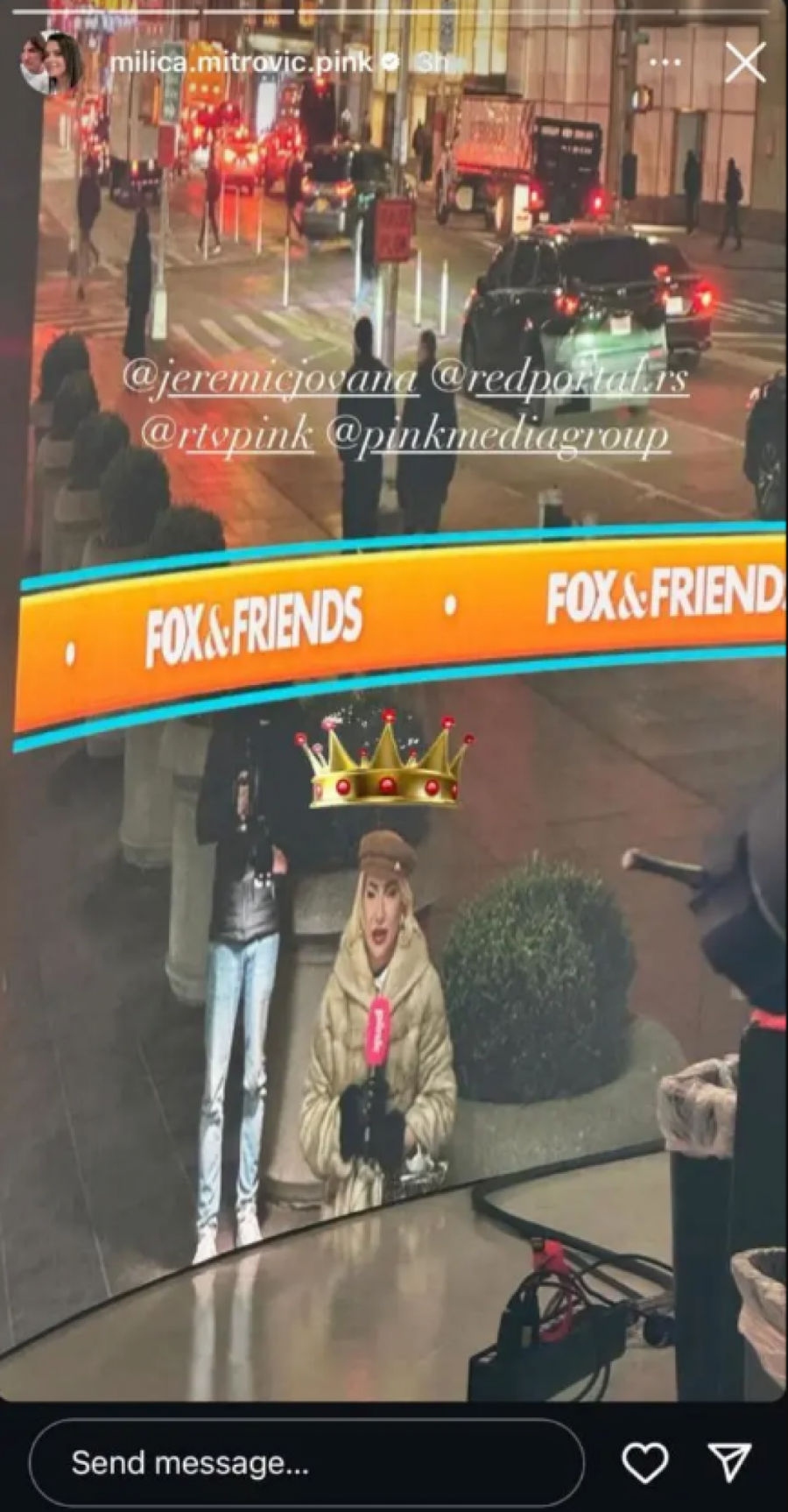 - Danas je ostvaren moj san, a ovo je samo početak. Uključenje života i karijere - Pink i "Fox and Friends". Kamere Fox televizije bile su uprte u nas kada su nas videli na platou ispred televizije i preneli su naš lajv u njihovom najgledanijem jutarnjem programu "Fox and Friends" - saopštila je Jovana Jeremić, koja se potom obratila čelnim ljudima Pinka, Milici i Željku Mitroviću.
