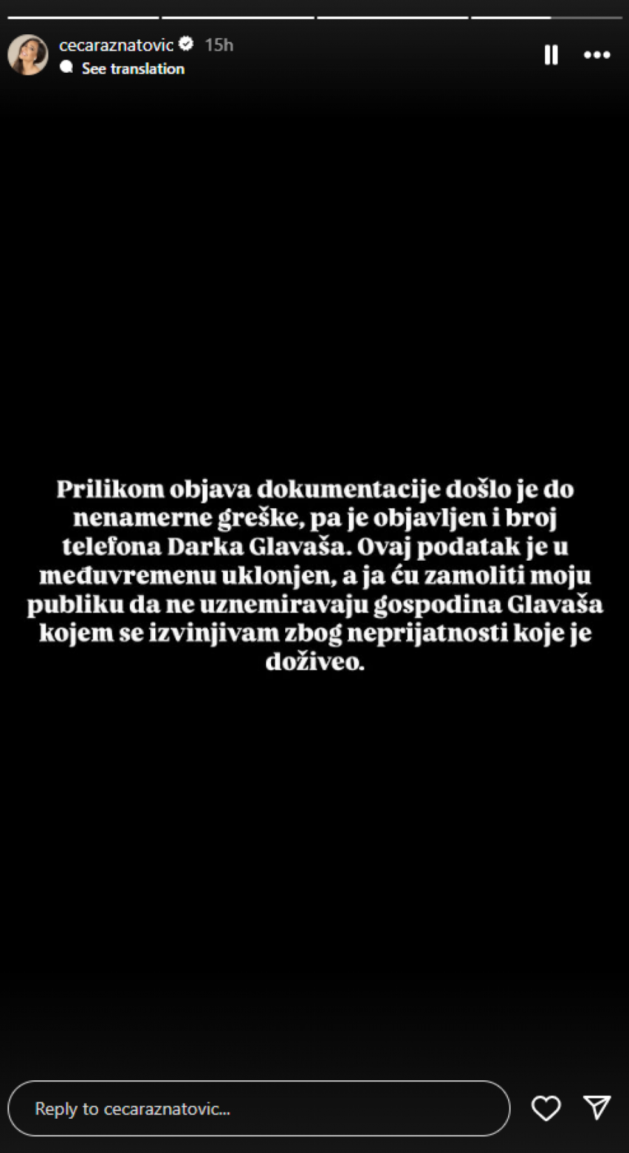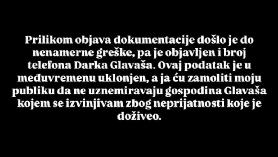 - Prilikom objava dokumentacije došlo je do nenamerne greške, pa je objavljen i broj telefona Darka Glavaša. Ovaj podatak je u međuvremenu uklonjen, a ja ću zamoliti moju publiku da ne uznemiravaju gospodina Glavaša, kojem se izvinjavam zbog neprijatnosti koje je doživeo - napisala je Ceca.