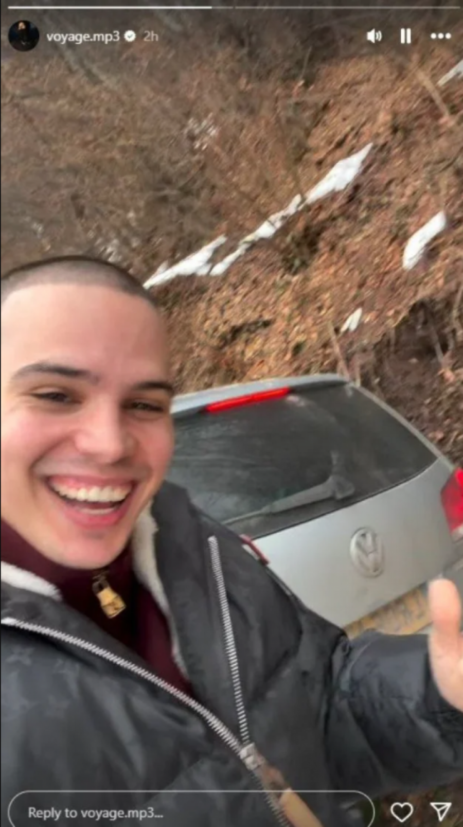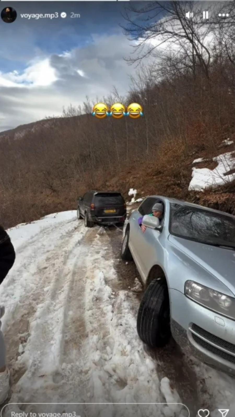 Na snimku koji je Vojaž objavio na Instagramu on izlazi iz automobila koji je završio skroz van kolovoza u blatnjavom jarku.
