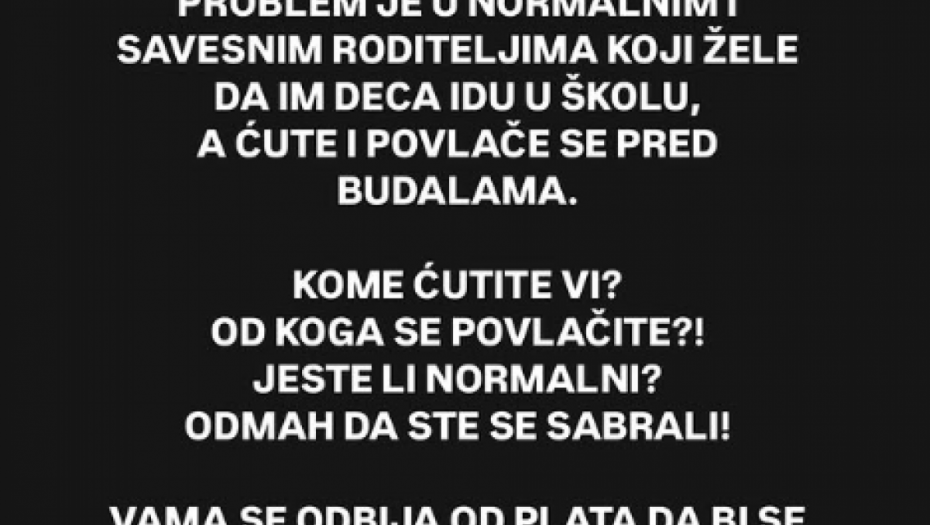 - Vama se odbija od plata da bi se vaša deca školovala. Da bi se davale plate tim nastavnicima. Je l' razumete da je protivzakonito da vam deca ne idu u školu? Odmah da ste se sabrali! Ne dozvolite da vam nesavesni roditelji i nastavnici koji primaju plate koje im vi plaćate ugrožavaju školovanje dece - napisala je pevačica na svom Instagram profilu.