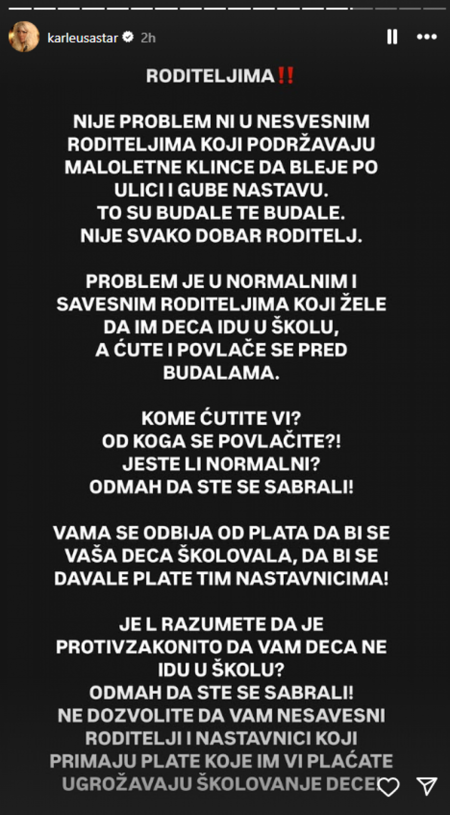 PROTIVZAKONITO JE DA VAM DECA NE IDU U ŠKOLU! Karleuša se javno obratila roditeljima: Odmah da ste se sabrali!