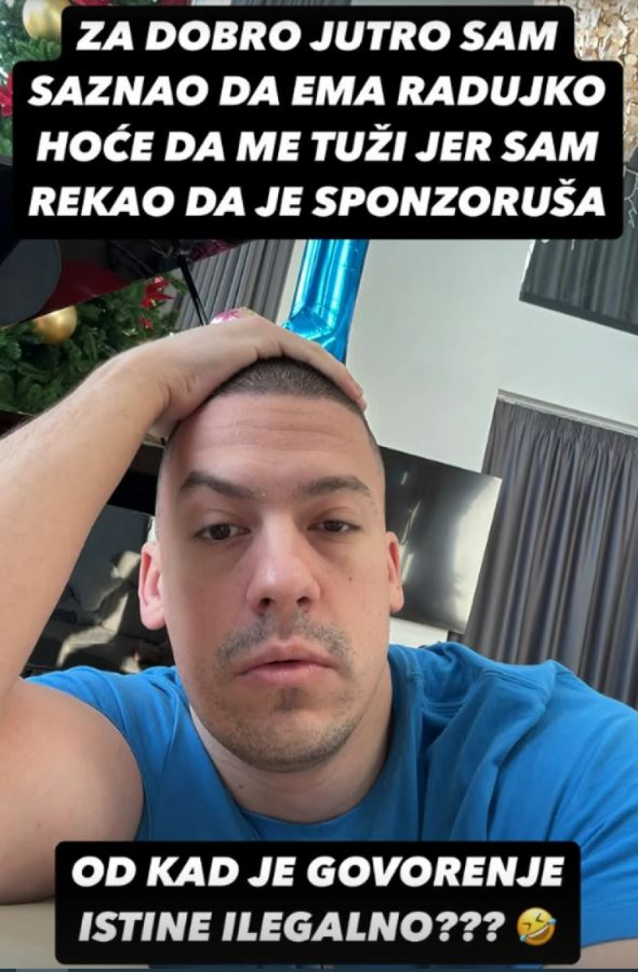 - Za dobro jutro sam saznao da Ema Radujko hoće da me tuži jer sam rekao da je sponzoruša. Otkad je govorenje istine ilegalno? - napisao je Jutjuber.