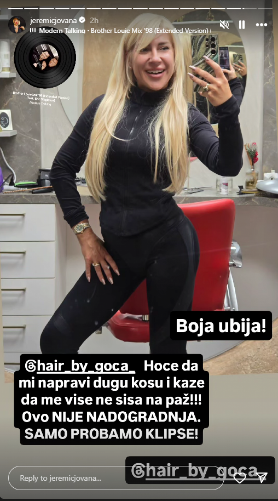 - Frizerka hoće da mi napravi dugu kosu i kaže da me više ne šiša na paž! Ovo nije nadogradnja, samo probamo klipse - poručila je Jovana, a ubrzo su ispod objave počeli da se nižu razni komentari.