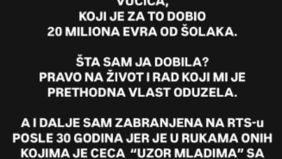 - Šta sam ja dobila? Pravo na život i rad koji mi je prethodna vlast oduzela. I dalje sam zabranjena na RTS posle 30 godina jer je u rukama onih kojima je Ceca "uzor mladima" sa sve nanogicom i jer je u rukama onih u čije vreme je jedan premijer ubijen, a jedan predsednik izručen strancima - poručila je Jelena u svom obraćanju na Instagram profilu.