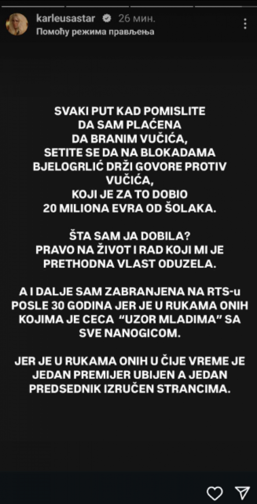 "U PITANJU JE IZNOS OD 20 MILIONA EVRA" Karleuša odgovorila na napade, spomenula i zabranu na RTS: Dobila sam ono što mi je prethodna vlast oduzela!