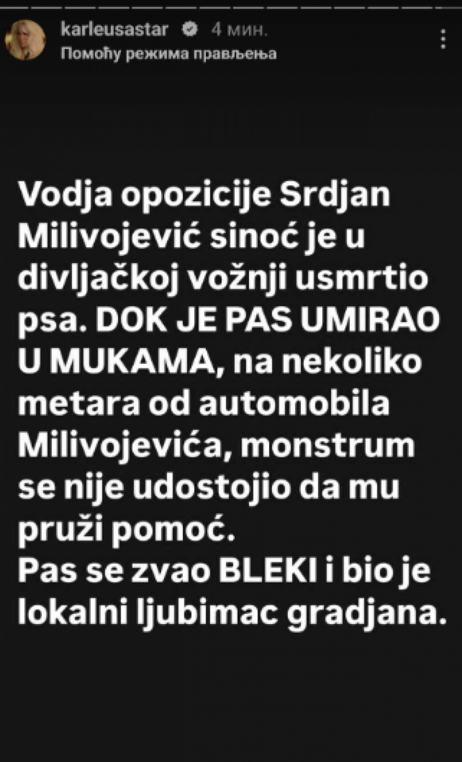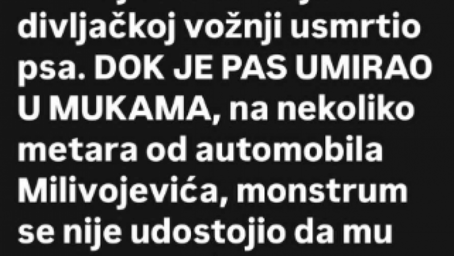 - Vođa opozicije Srđan Milivojević sinoć je u divljačkoj vožnji usmrtio psa. Dok je pas umirao u mukama, na nekoliko metara od automobila Milivojevića, monstrum se nije udostojio da mu pruži pomoć. Pas se zvao Bleki i bio je lokalni ljubimac građana - napisala je Jelena.