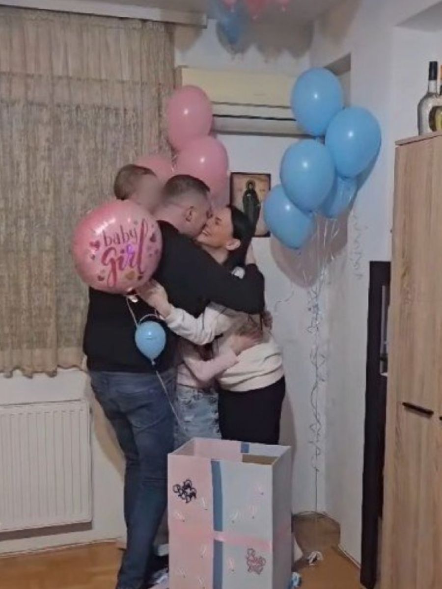 Slobina i Mirjanina ćerka je prvo skinula mašnu sa kutije iz koje su izašli roze i plavi baloni, a na dnu se nalazio veliki balon na kom je pisalo da je devojčica.