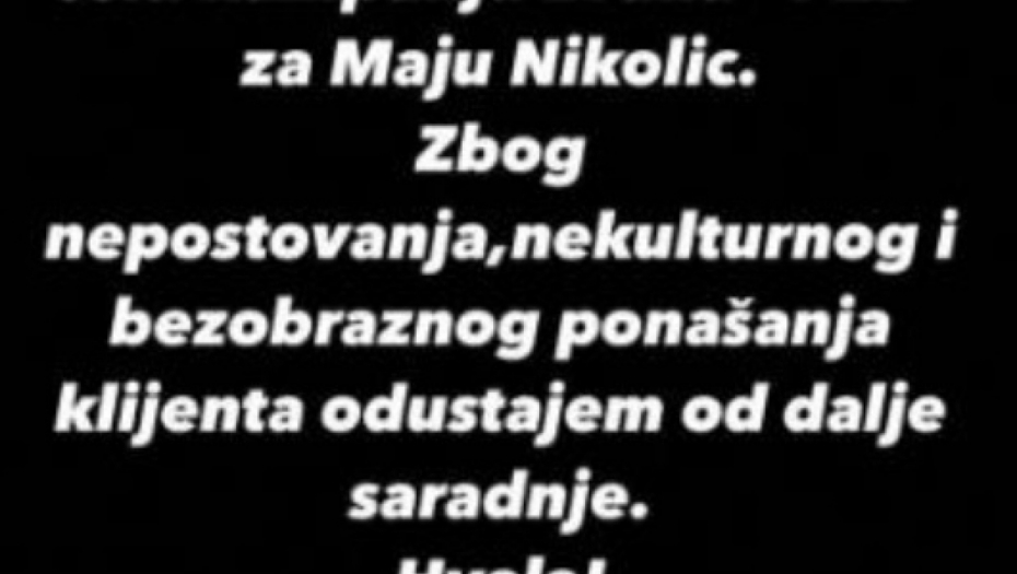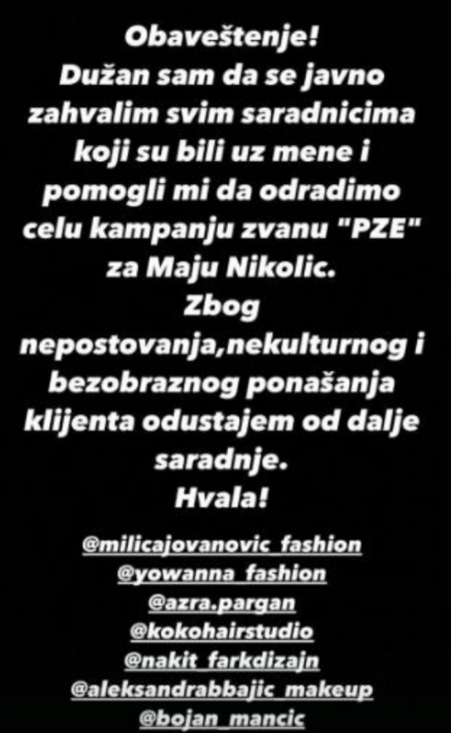 - Obaveštenje! Dužan sam da se javno zahvalim svim saradnicima koji su bili uz mene i pomogli mi da odradimo celu kampanju zvanu PZE! Zbog nepoštovanja, nekulturnog i bezobraznog ponašanja klijenta, obustavljam dalju saradnju! - napisao je on na svom Instagram profilu.
