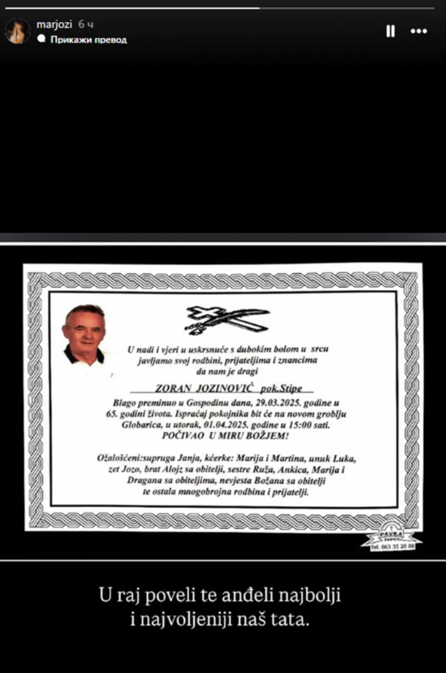 - U raj poveli te anđeli. Najbolji i najvoljeniji naš tata - poručila je Martina skrhana od bola.