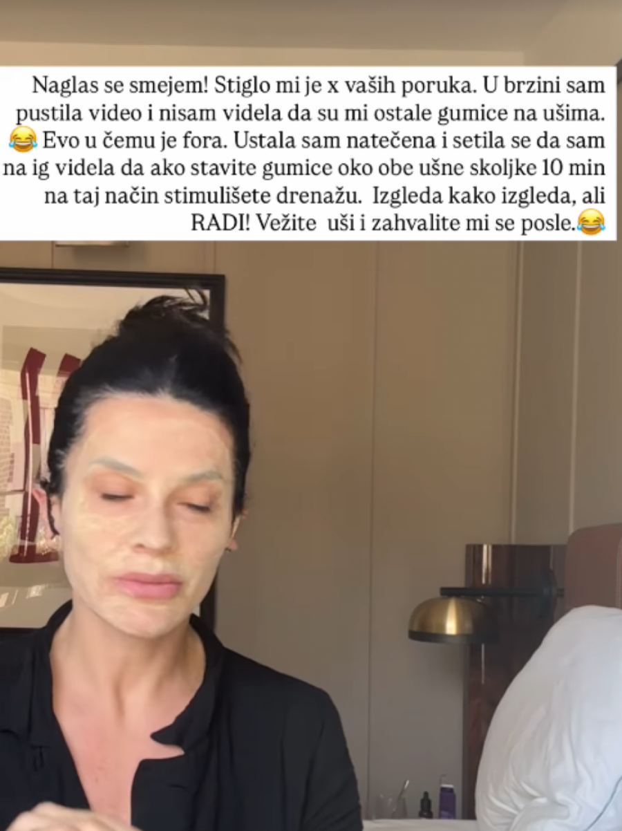- Naglas se smejem. Stiglo mi je X vaših poruka. U brzini sam pustila video i nisam videla da su mi ostale gumice na ušima. Evo u čemu je fora: Ustala sam natečena i setila se da sam na Instagramu videla da ako stavite gumice oko obe ušne školjke 10 minuta na taj način stimulišete drenažu. Izgleda kako izgleda, ali radi! Vežite uši i zahvalite mi posle - napisala je ona i dodala nekoliko smajlija.