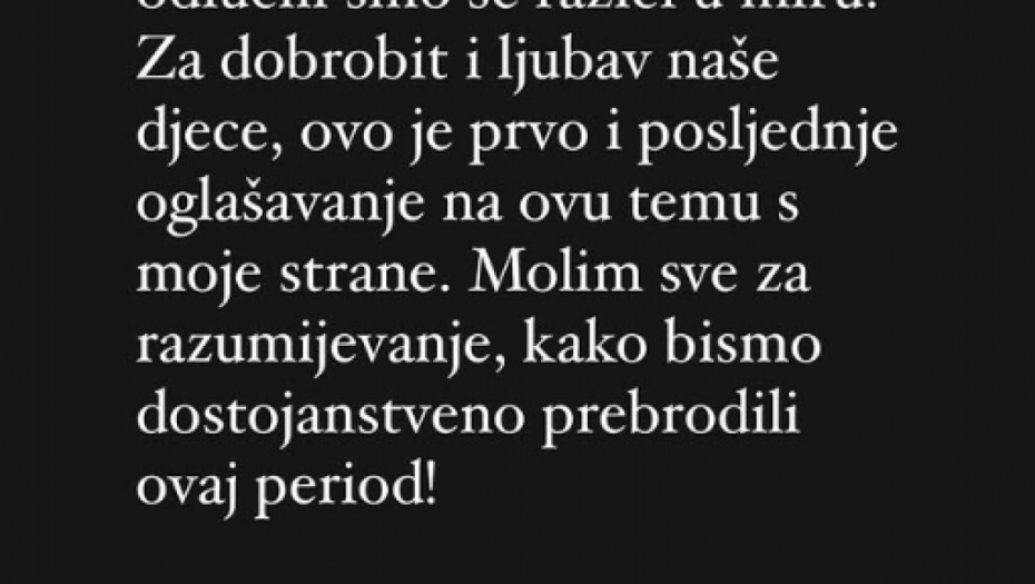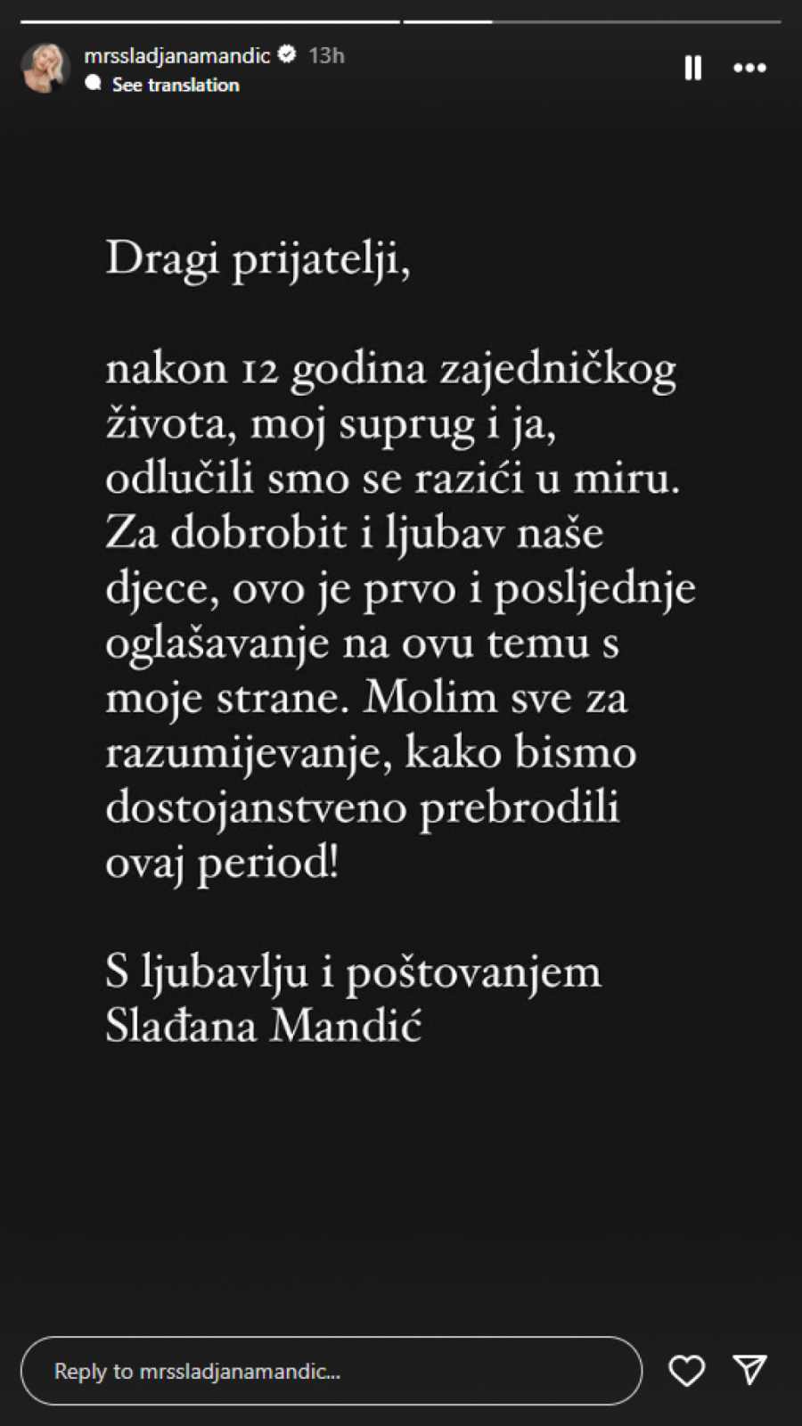 - Dragi prijatelji nakon 12 godina zajedničkog života, moj suprug i ja, odlučili smo se razići u miru. Za dobrobit i ljubav naše dece, ovo je prvo i poslednje oglašavanje na ovu temu s moje strane. Molim sve za razumevanje, kako bi smo dostojanstveno prebrodili ovaj period! S ljubavlju i poštovanjem Slađana Mandić - napisala je ona.