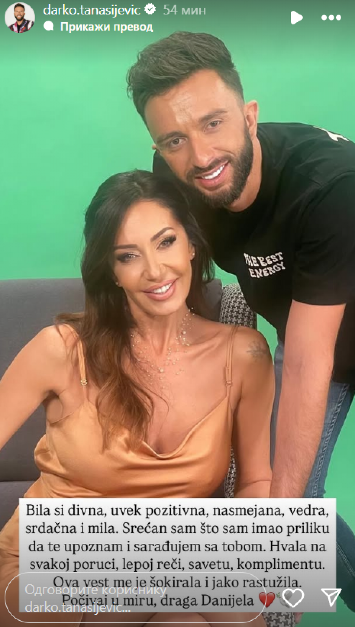 Od Daniele opraštaju se prijatelji i saradnici, a među njima tu je i voditelj Darko Tanasijević koji je objavio sliku koleginici, a ispod nje i oproštajnu poruku.