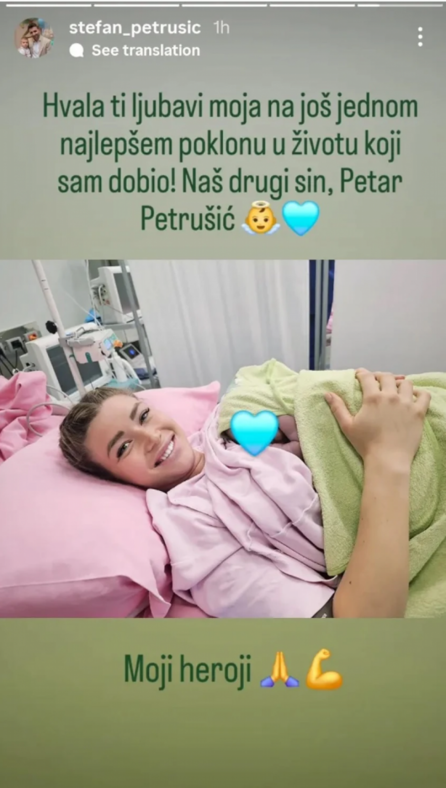 - Hvala ti ljubavi na još jednom najlepšem poklonu u životu koji sam dobio! Naš drugi sin, Petar Petrušić. Moji heroji - napisao je pevač ponosno uz fotografiju iz porodilišta dok su se nizale čestitke prijatelja i kolega.