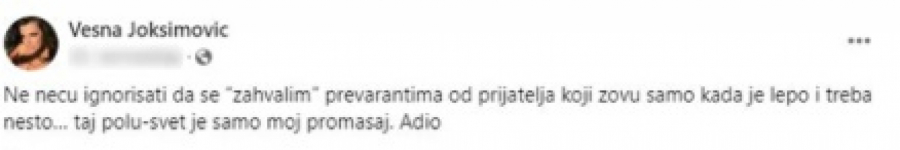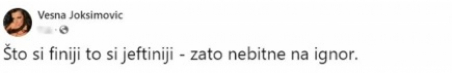 - Što si finiji, to si jeftiniji! Zato nebitne na ignor! - napisala je Vesna Joksimović u drugoj objavi.