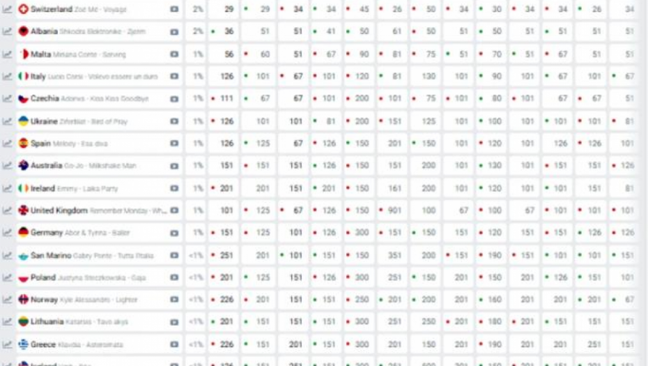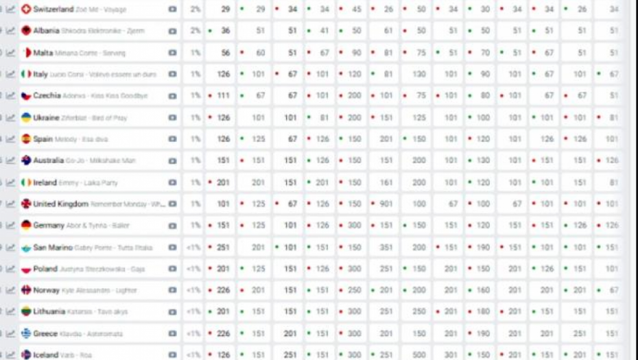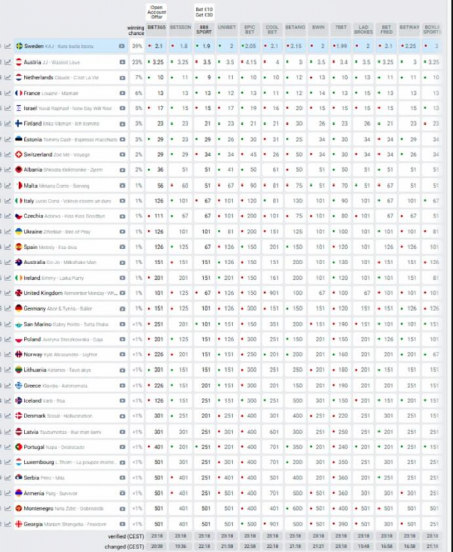Pad na kladionici takođe se dogodio i predstavniku Švedske, kojem iste predviđaju pobedu, pa im se procenat za pobedu sa 44% spustio na 39%, a Austrija je još uvek na drugom mestu.