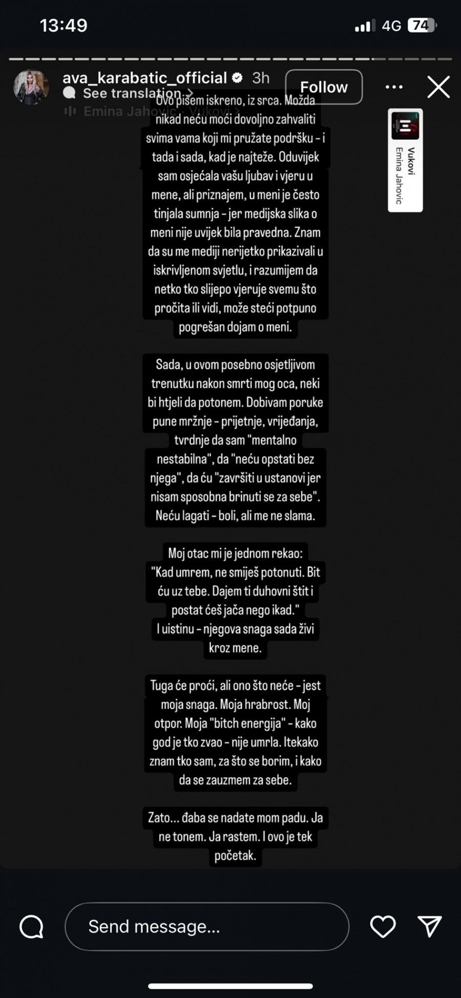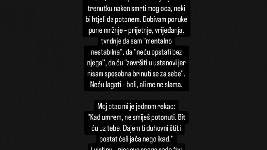 - Ovo pišem iskreno, iz srca. Možda neću moći nikad dovoljno da se zahvalim svima vama koji mi pružate podršku i tada i sada kad je najteže. Oduvek sam osećala vašu ljubav i veru u mene, ali priznajem, u meni je često tinjala sumnja jer medijska slika o meni nije uvek bila pravedna. Sada u ovom posebno osetljivom trenutku, nakon smrti mog oca, neki bi hteli da potonem. Dobijam poruke pune mržnje, pretnje, vređanja. Pišu mi da sam mentalno nestabilna I da ću završiti u ustanovi jer nisam spsobna da brinem o sebi. Neću lagati, boli, ali ne slama - napisala je Ava i dodala: