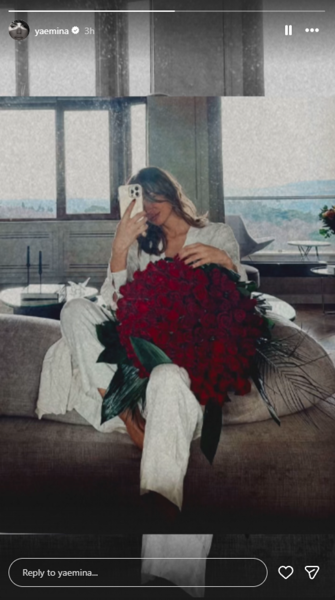 Pevačica se fotografisala sa buketom crvenih ruža dok sedi na krevetu.
