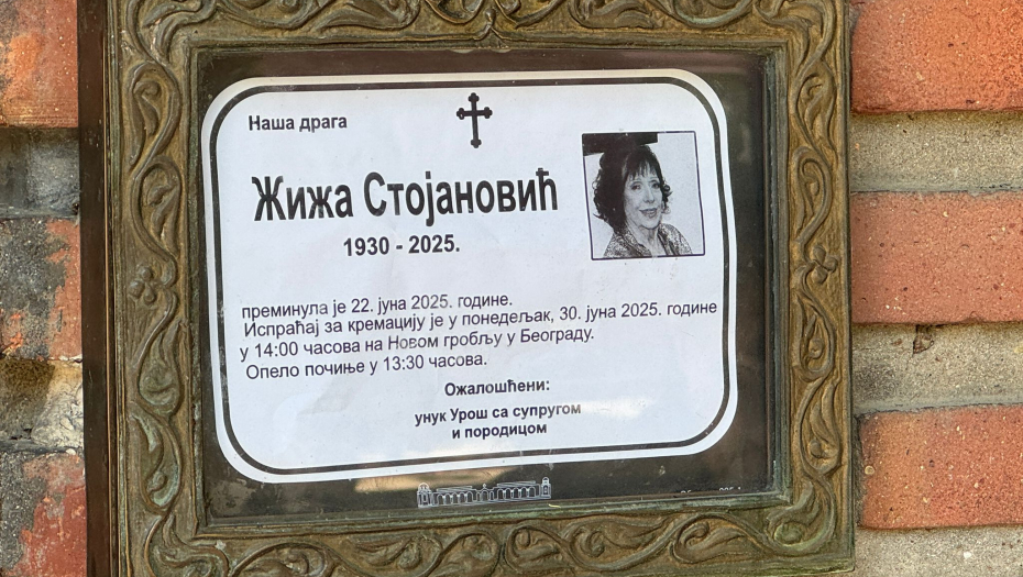- Naša draga Žiža Stojanović preminula je 22. juna 2025. godine. Ispraćaj za kremaciju je u ponedeljak 30. juna 2025. godine u 14:00 časova na Novom groblju u Beogradu. Opelo počinje u 13:30 časova. Ožalošćeni: unuk Uroš sa suprugom i porodicom - navedeno je na umrlici.