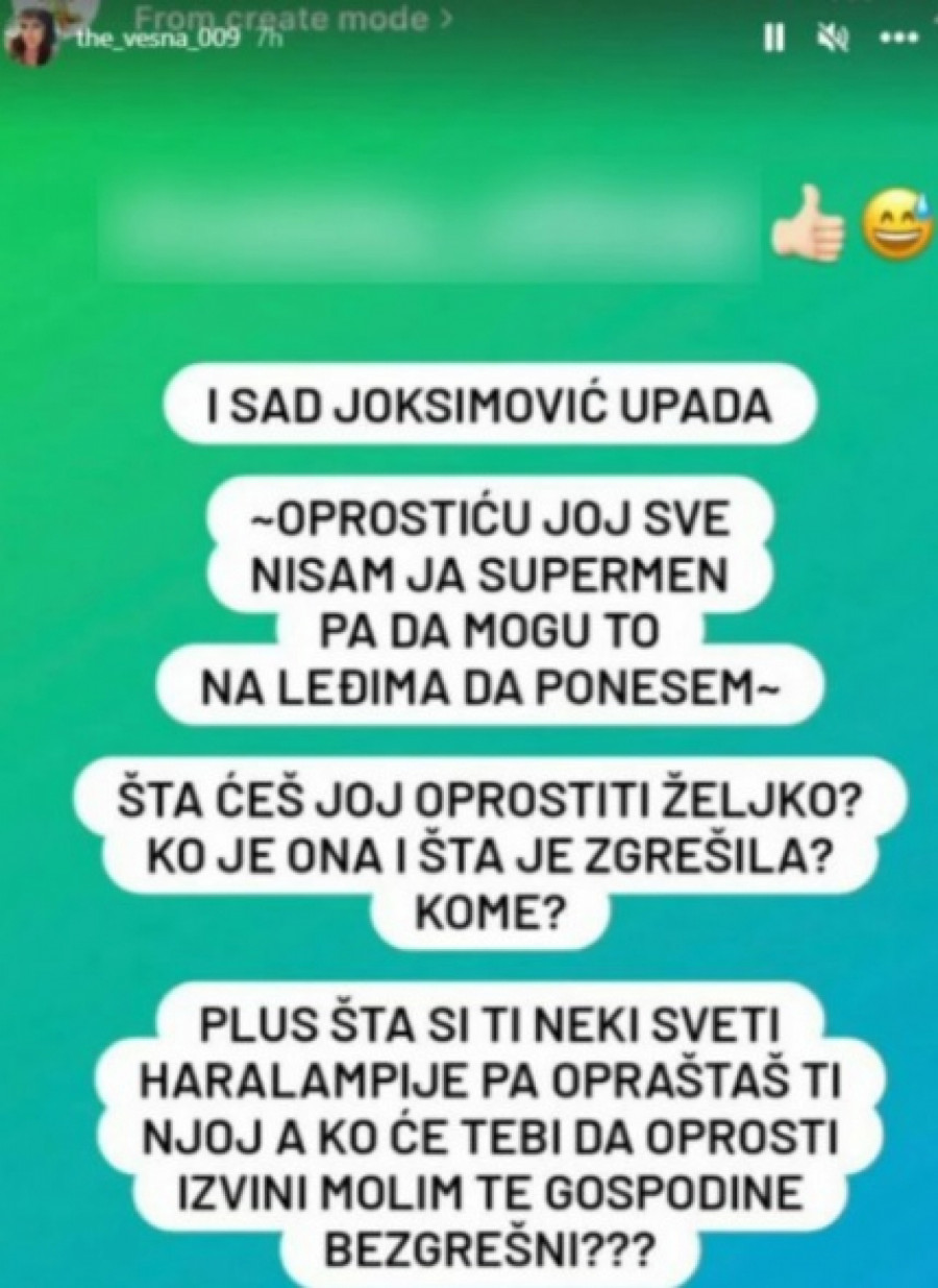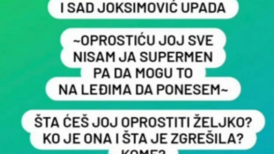 - I sad Joksimović upada: ‘Oprostiću joj sve, nisam ja Supermen, pa da mogu to na leđima da ponesem’... Šta ćeš joj oprostiti, Željko? Ko je ona i šta je zgrešila? Kome? Plus, šta si ti, neki sveti Haralampije, pa opraštaš ti njoj... A ko će tebi da oprosti, izvini, molim te, gospodine bezgrešni? - stajalo je u njenoj objavi.