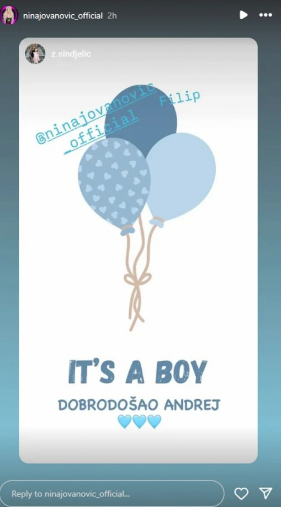 Lepe vesti Nina Jovanović je objavila na Instagramu, a tom prilikom je otkrila da je nasledniku dala ime Andrej.