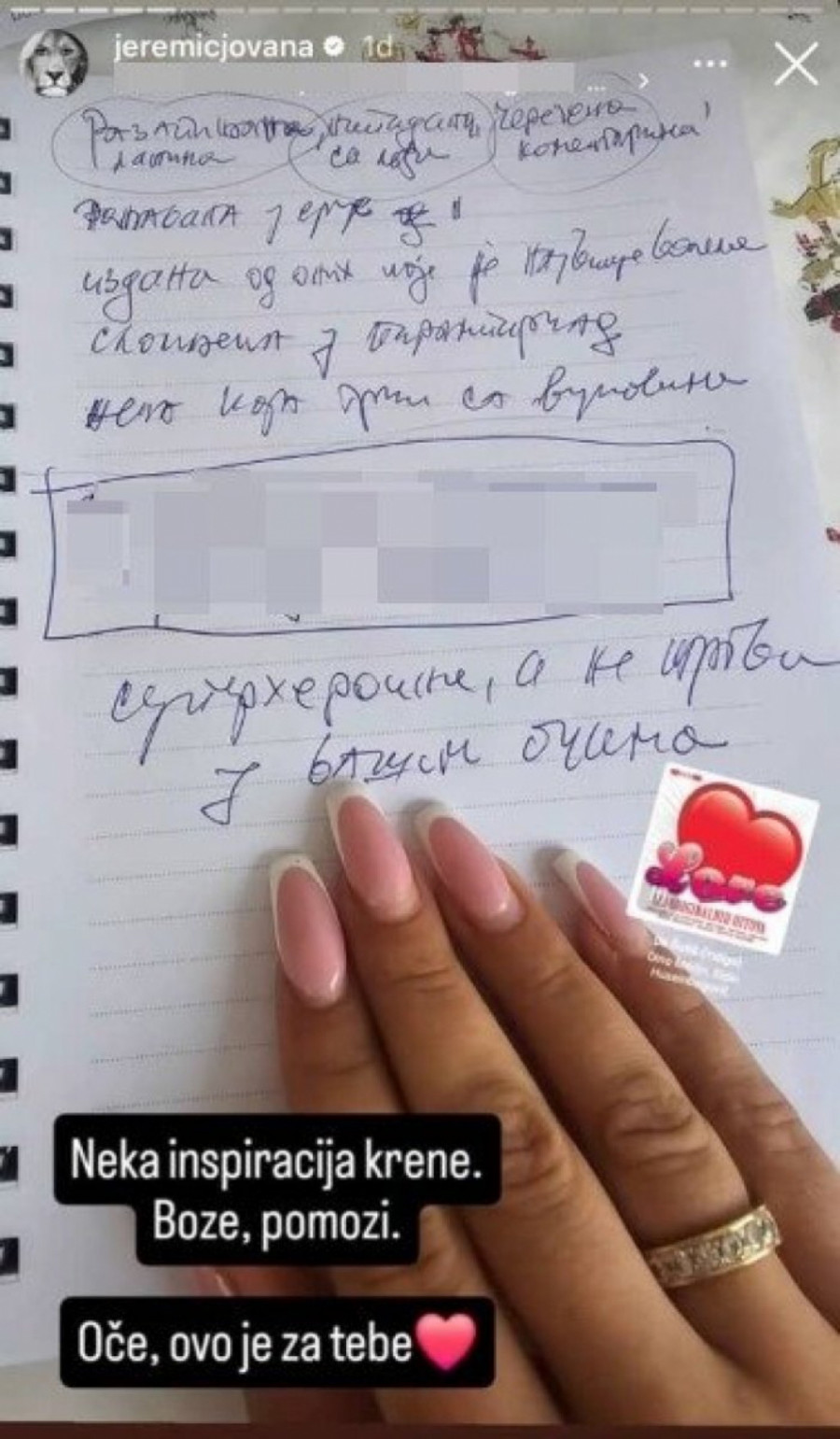 – Izdana od onih koje sam najviše volela, slomljena u paramparčad. Žena koja trči s vukovima. Neka inspiracija krene. Bože, pomozi – napisala je Jovana, koja knjigu piše u čast svom ocu Miogradu, koji je krajem juna izgubio bitku s teškom bolešću.
