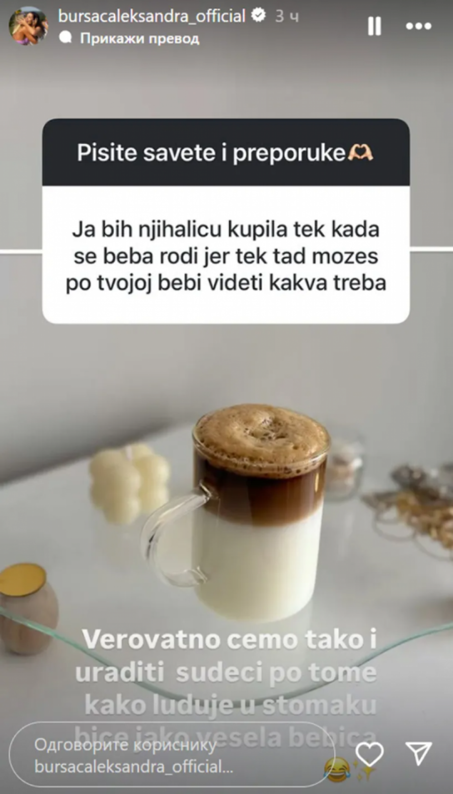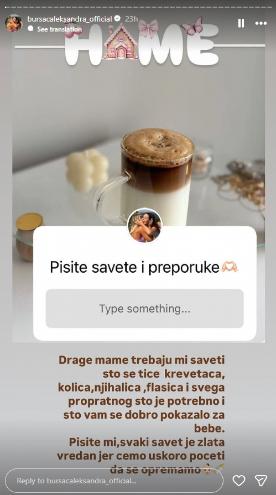 - Drage mame, trebaju mi saveti što se tiče krevetaca, kolica, njihalica, flašica i svega propratnog što je potrebno i što vam se dobro pokazalo za bebe. Pišite mi, svaki savet je zlata vredan jer ćemo uskoro početi da se opremamo - napisala je Bursaćeva.