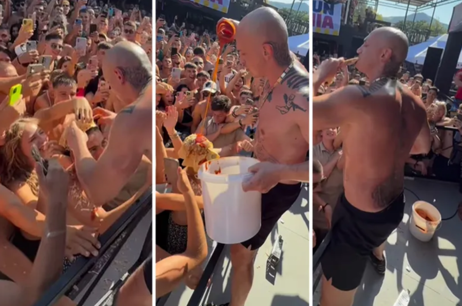 Umesto klasične kuhinje, "kuhinjski pult" mu je bila glava jednog od fanova koji je stajao ispred bine.