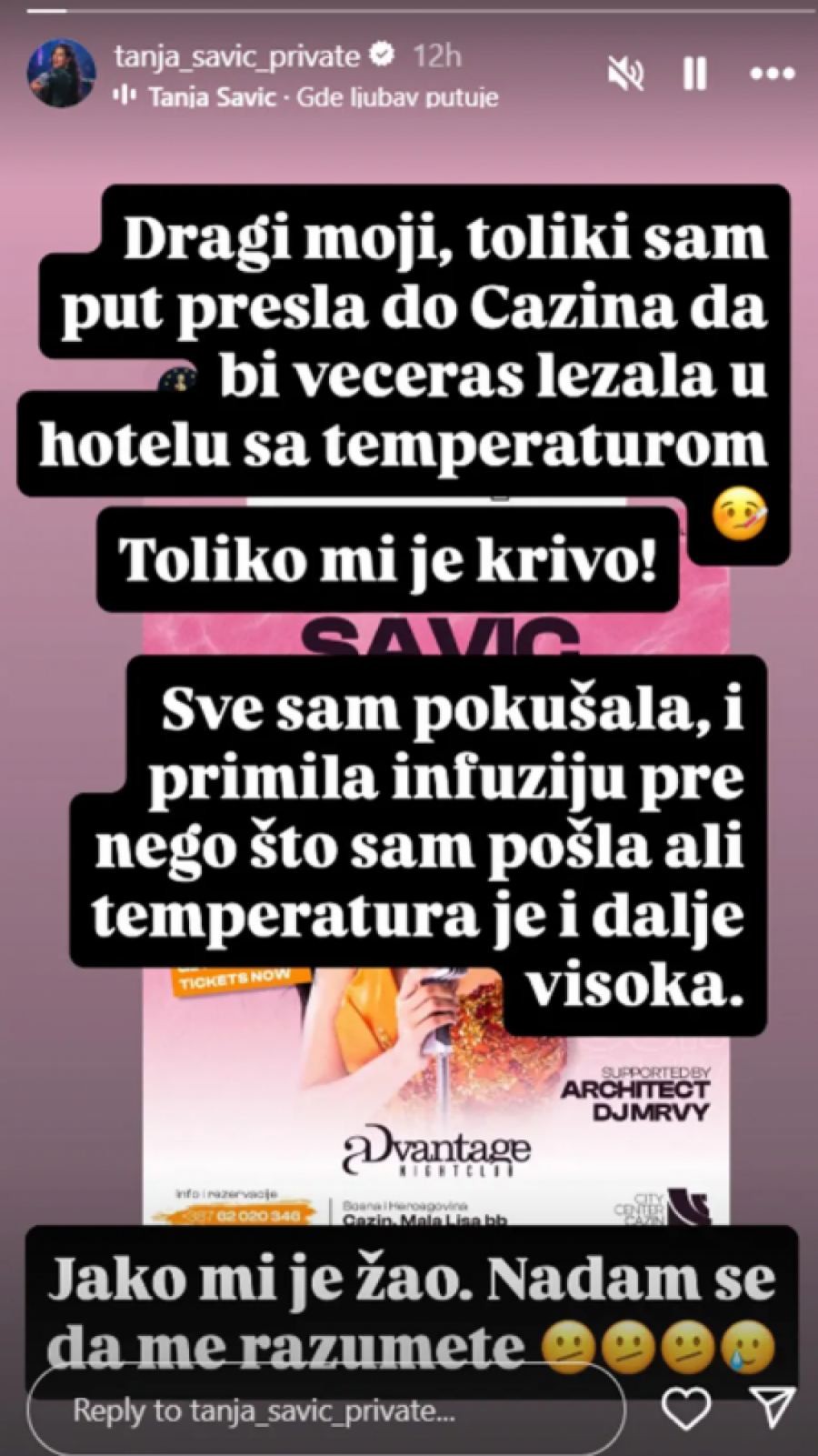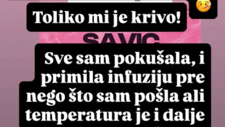 - Dragi moji, toliki sam put prešla do Cazina da bih večeras ležala u hotelu sa temperaturom. Toliko mi je krivo. Sve sam pokušala, i primila infuziju pre nego što sam pošla ali temperatura je i dalje visoka. Jako mi je žao. Nadam se da me razumete - napisala je Savićeva.