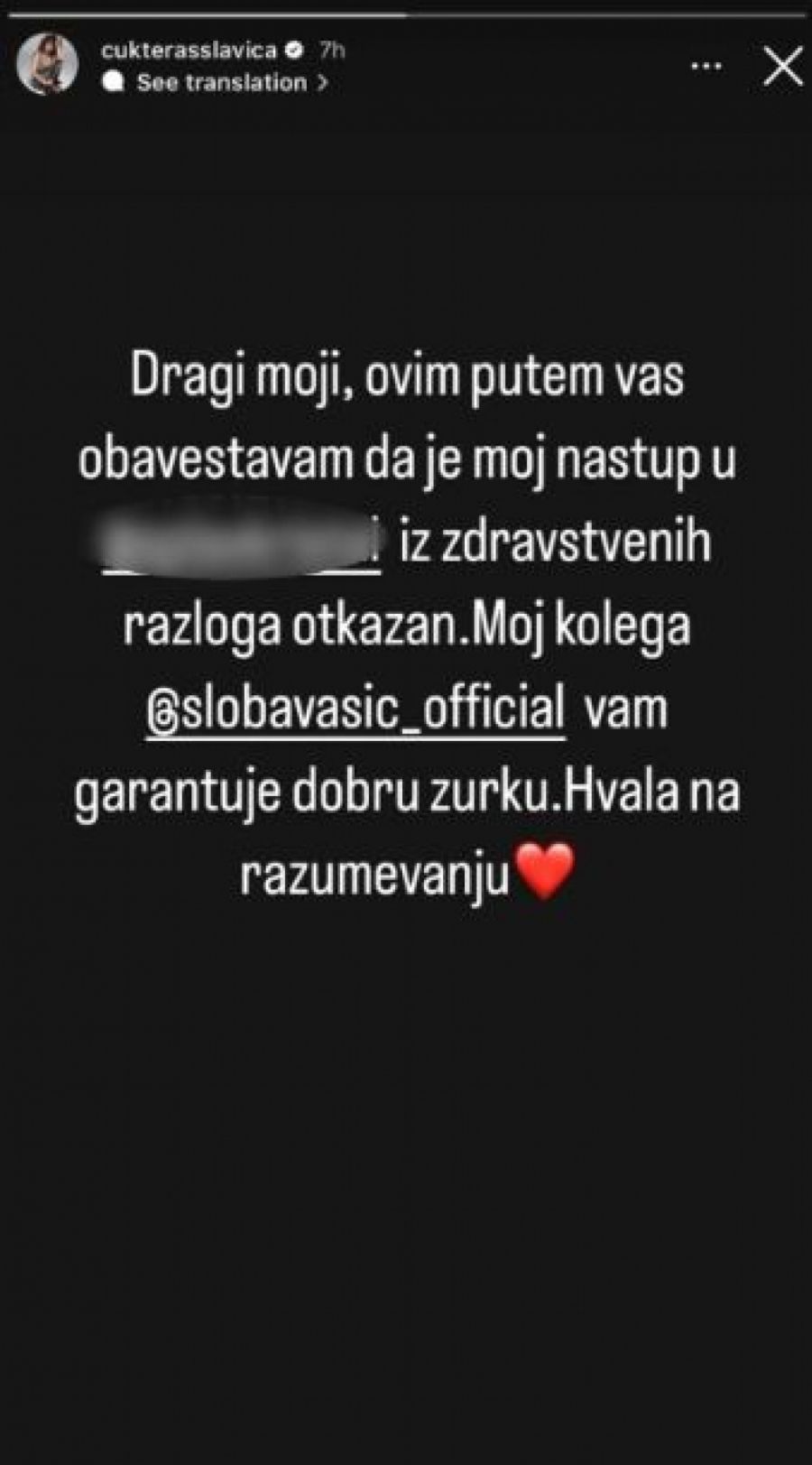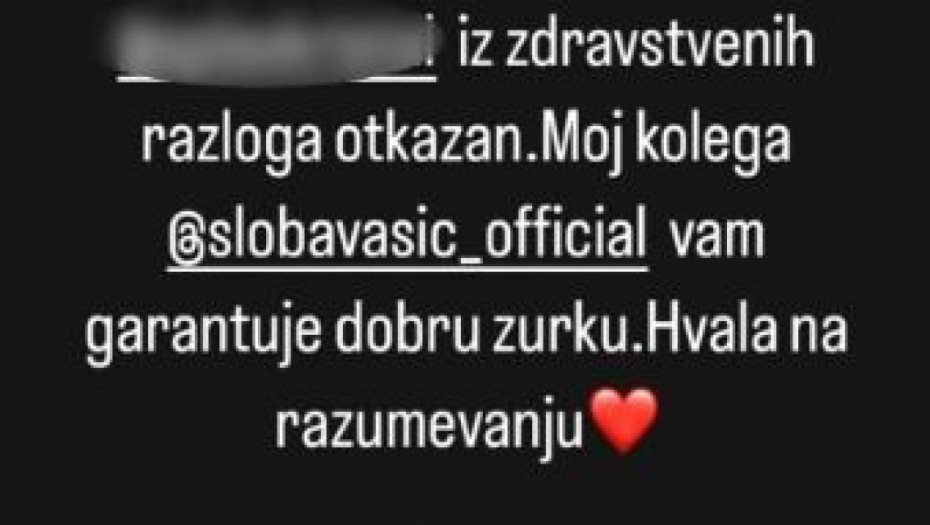 - Dragi moji, ovim putem vas obaveštavam da je moj nastup iz zdravstvenih razloga otkazan. Moj kolega Sloba Vasić vam garantuje dobru žurku. Hvala na razumevanju - napisala je Slavica Ćukteraš.