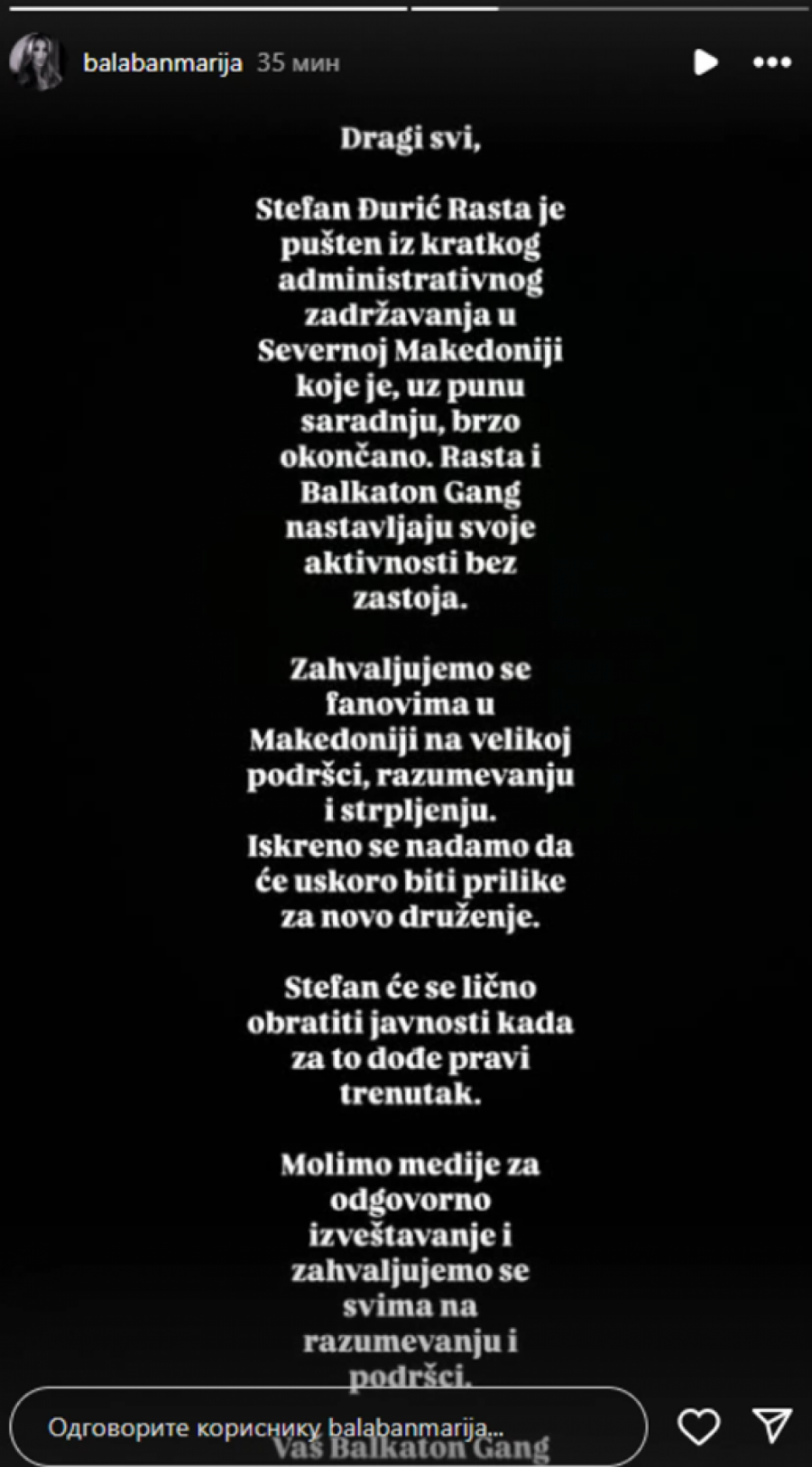 - Stefan Đurić Rasta je pušten iz kratkog administrativnog zadržavanja u Severnoj Makedoniji koje je, uz punu saradnju, brzo okončano. Rasta i Balkaton Gang nastavljaju svoje aktivnosti bez zastoja. Zahvaljujemo se fanovima u Makedoniji na velikoj podršci, razumevanju i strpljenju. Iskreno se nadamo da će uskoro biti prilike za novo druženje. Stefan će se lično obratiti javnosti kada za to dođe pravi trenutak. Molimo medije za odgovorno izveštavanje i zahvaljujemo se svima na razumevanju i podršci. Vaš Balkaton Gang - piše u saopštenju njegovog tima, koje je i ona objavila na pomenutoj društvenoj mreži.