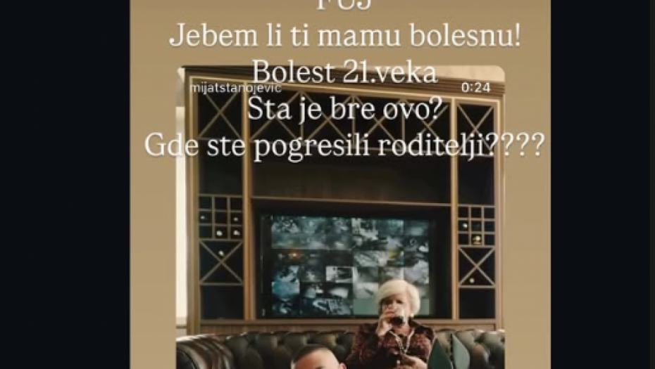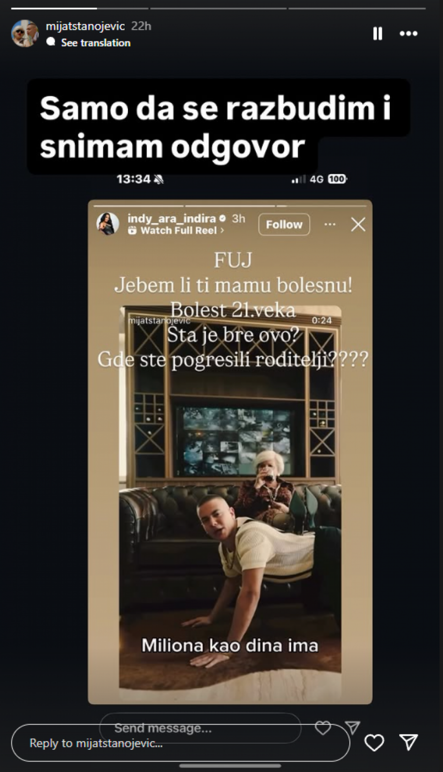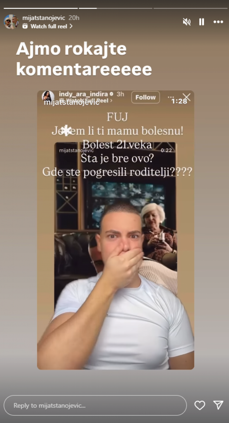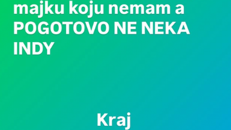 - Fuj! Je*em li ti mamu bolesnu! Bolest 21. veka! Šta je bre ovo? Gde ste pogrešili roditelji? - napisala je Indi na svom storiju.