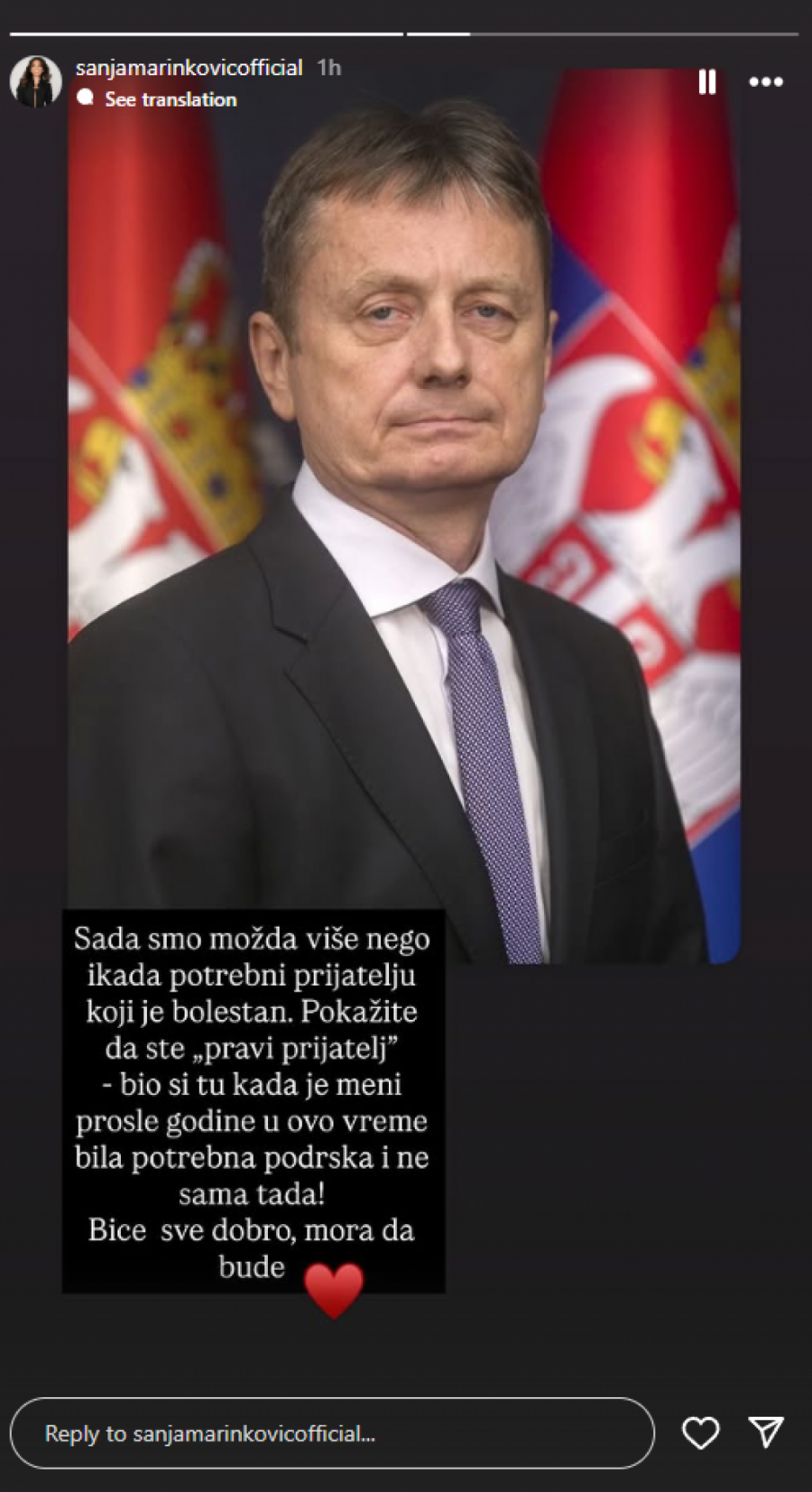Voditeljka televizije Pink, Sanja Marinković, oglasila se putem društvene mreže Instagram, javno pruživši podršku svom prijatelju, uz uverenje da će sve biti u redu.