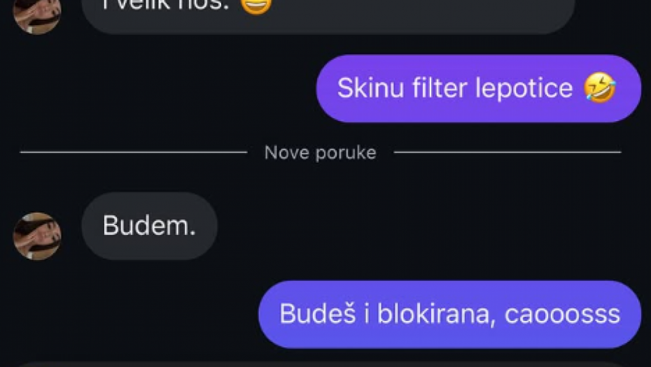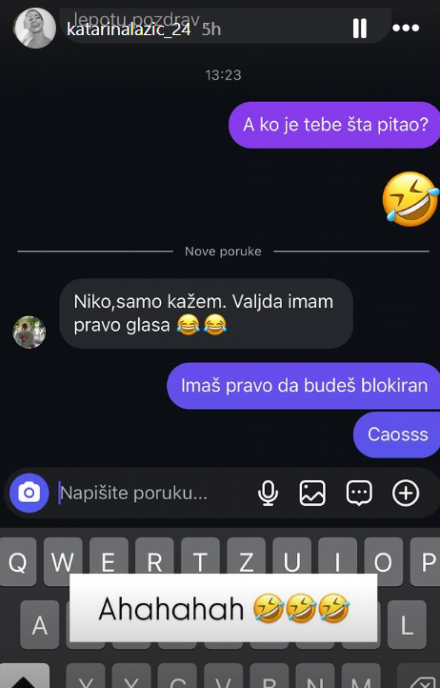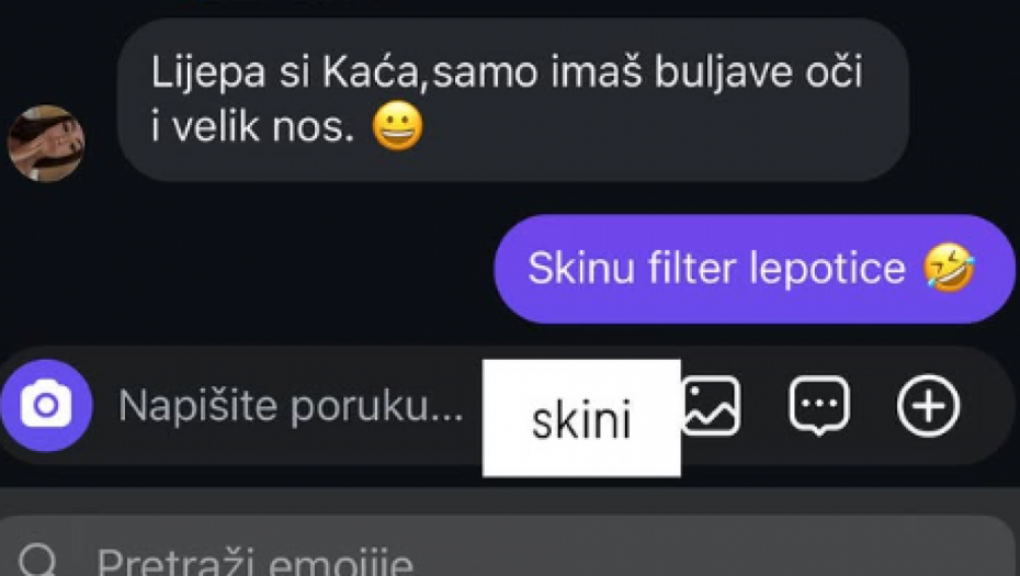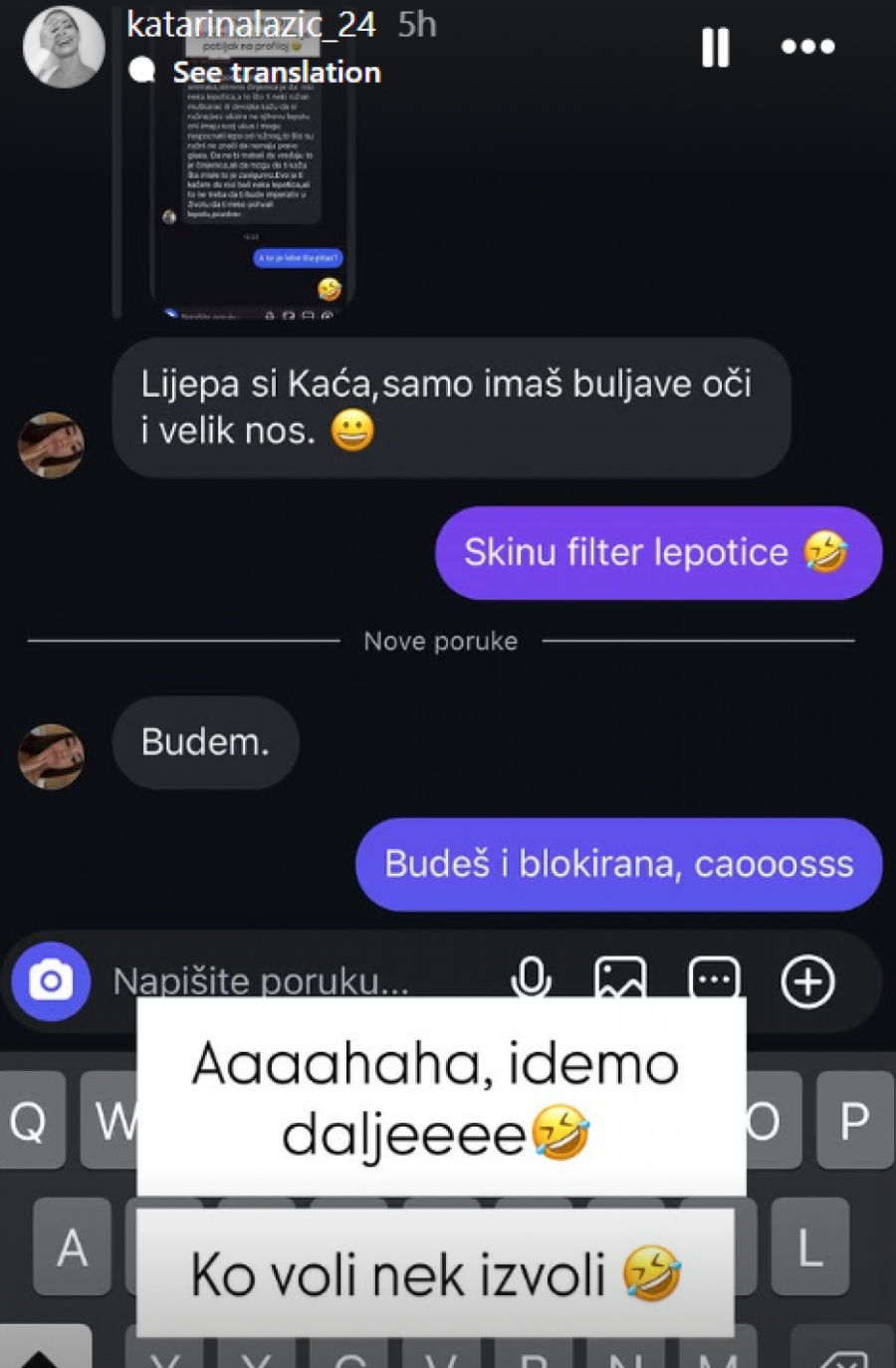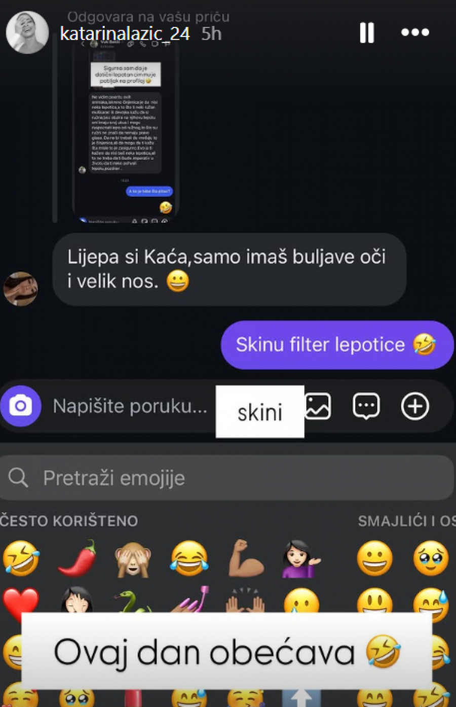 - Lepa si, Kaća, samo imaš buljave oči i veliki nos – glasila je jedna od poruka, nakon koje je Katarina blokirala dotičnu osobu, a potom napisala sledeće: