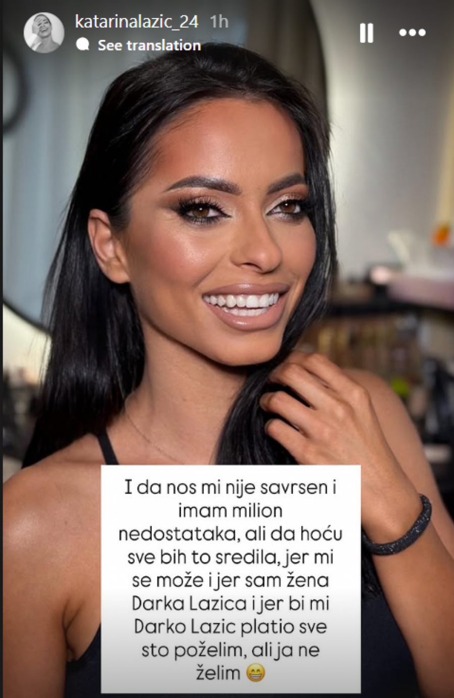 - I da, nos mi nije savršen, imam milion nedostataka, ali da hoću, sve bih to sredila, jer mi se može i jer sam žena Darka Lazića, i jer bi mi Darko platio sve što poželim. Ali, ne želim - zaključila je Katarina.