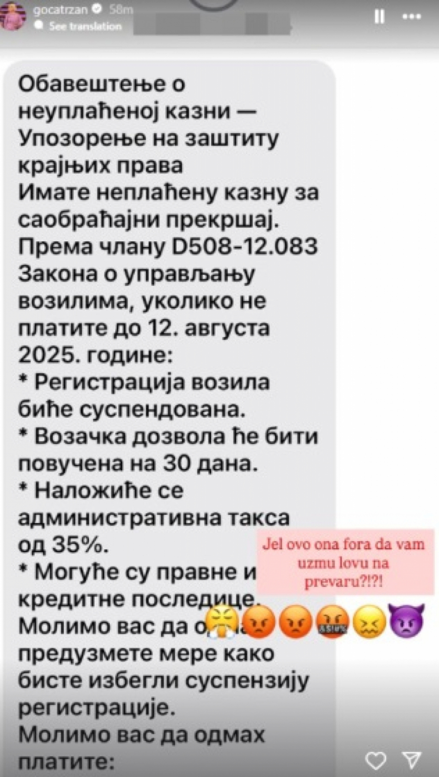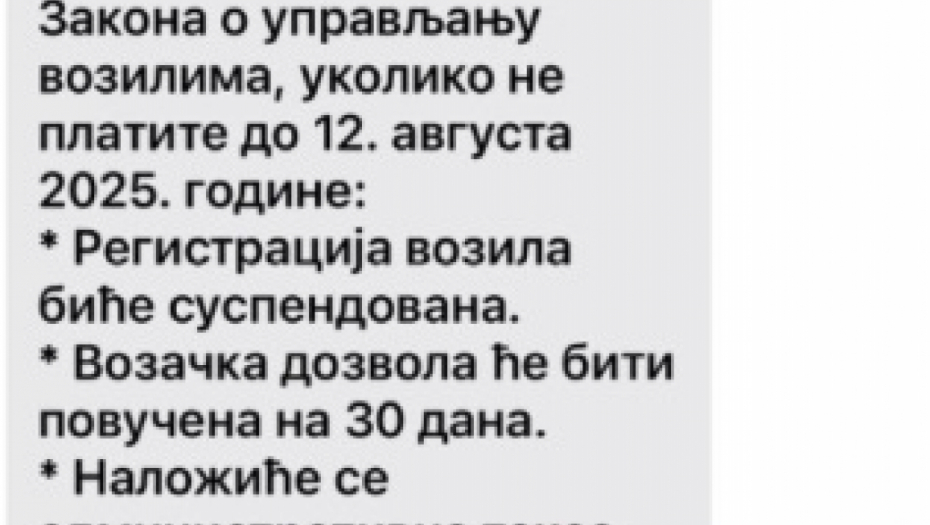 - Obaveštenje o neuplaćenoj kazni Upozorenje na zaštitu krajnjih prava Imate neplaćenu kaznu za saobraćajni prekršaj. Prema članu D508-12.083 Zakona o upravljanju vozilima, ukoliko ne platite do 12. avgusta 2025. godine: registracija vozila biće suspendovana, vozačka dozvola će biti povučena na 30 dana, naložiće se administrativna taksa od 35 odsto, moguće su pravne i kreditne posledice. Molimo vas da odmah preduzmete mere kako biste izbegli suspenziju registracije. Molimo vas da odmah platite - piše u poruci koja je stigla pevačici.