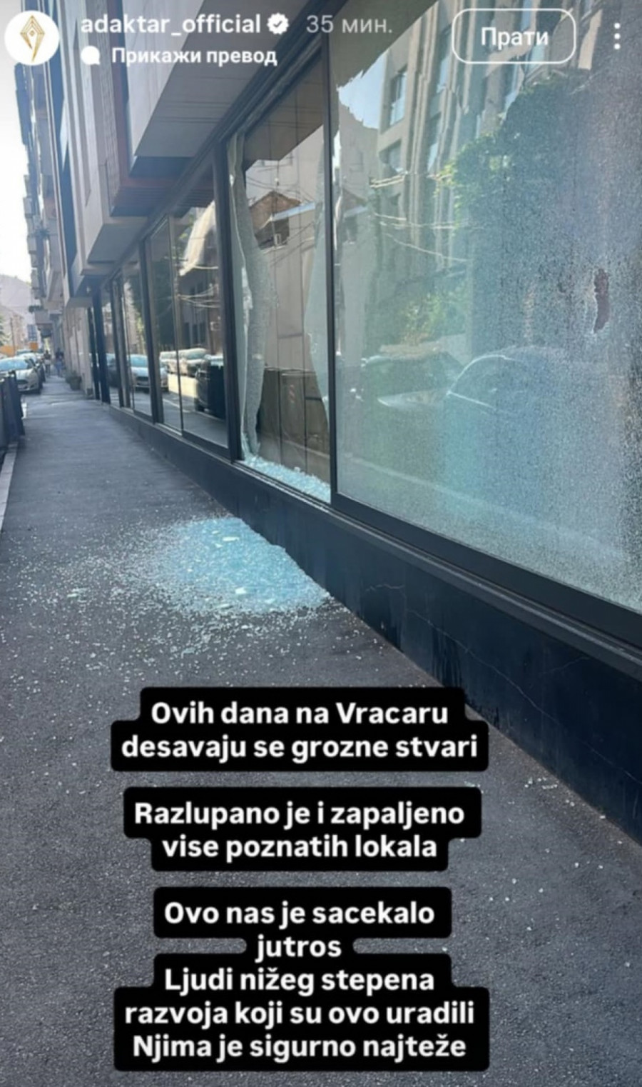 - Ovih dana na Vračaru se dešavaju grozne stvari. Razlupano je i zapaljeno više poznatih lokala. Ovo nas je sačekalo jutros. Ljudi nižeg stepena razvoja koji su ovo uradili, njima je sigurno najteže - napisao je Adaktar, te otkrio kolika je šteta.