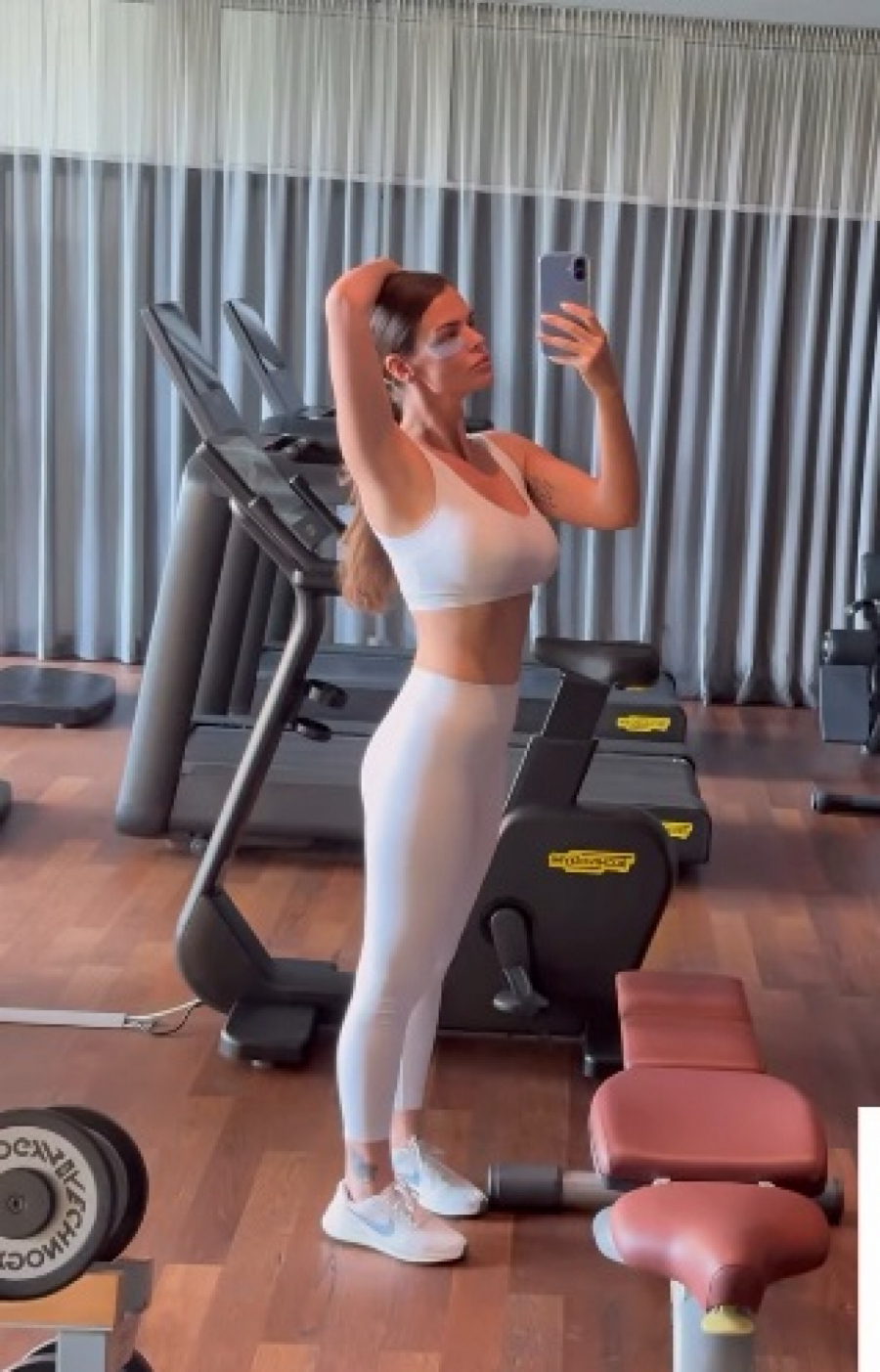 Bila je obučena u usku belu trenerku i patike, dok je gore imala top, a u prvom planu bile su i njene bujne grudi.