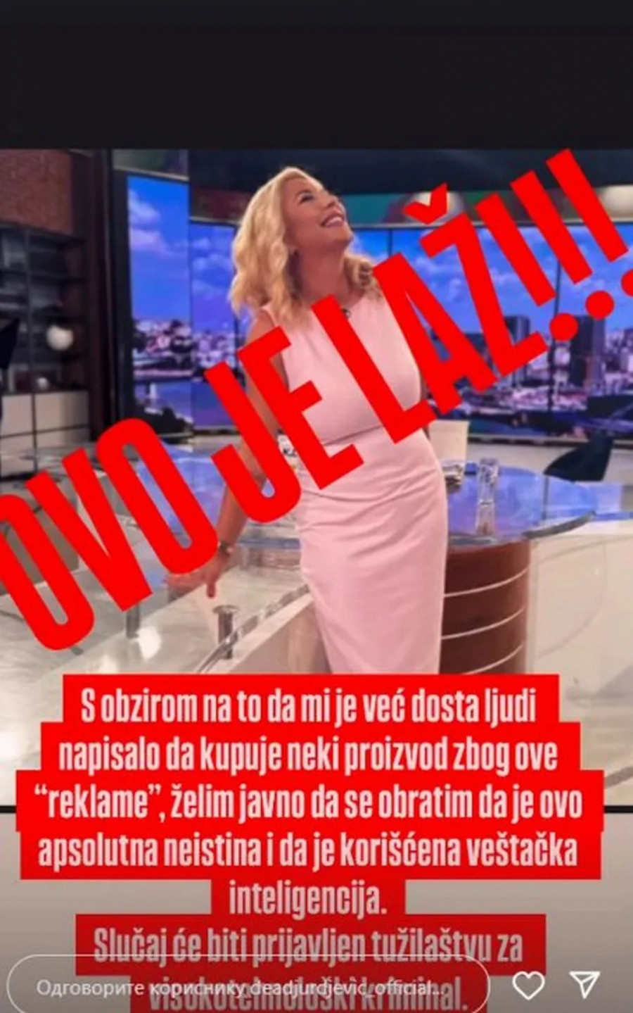 - Ovo je laž! S obzirom na to da mi je već dosta ljudi napisalo da kupuje neki proizvod zbog ove "reklame", želim javno da se obratim da je ovo apsolutna neistina i da je korišćena veštačka inteligencija. Slučaj će biti prijavljen tužilaštvu za visokotehnološki kriminal - napisala je Dea.