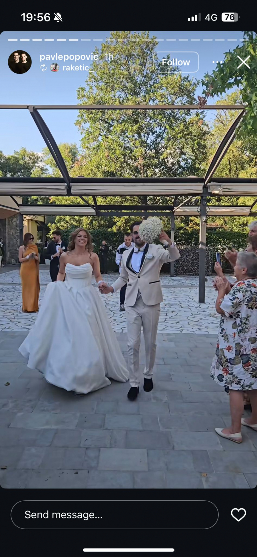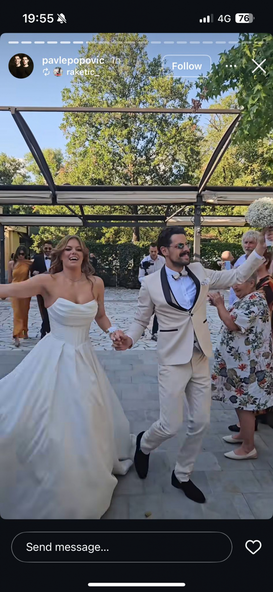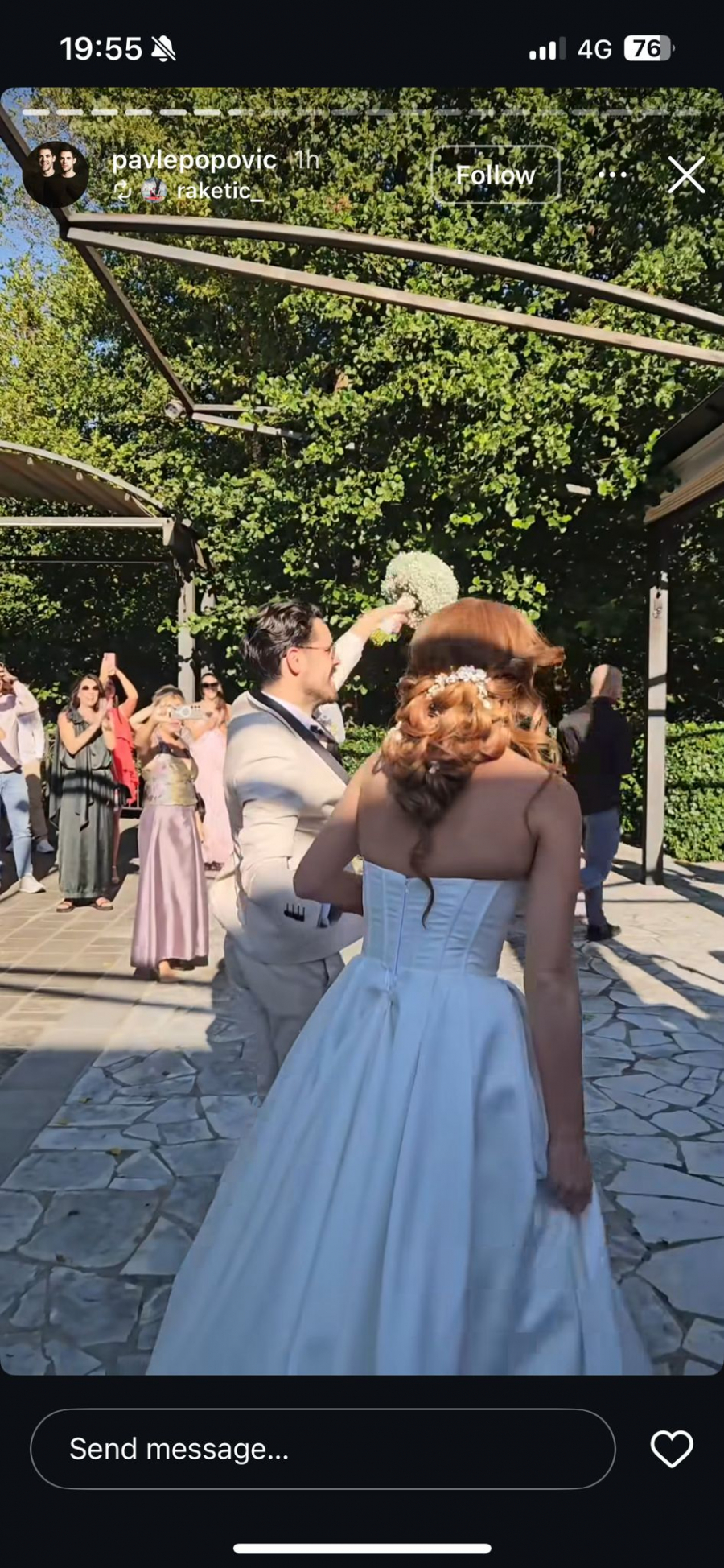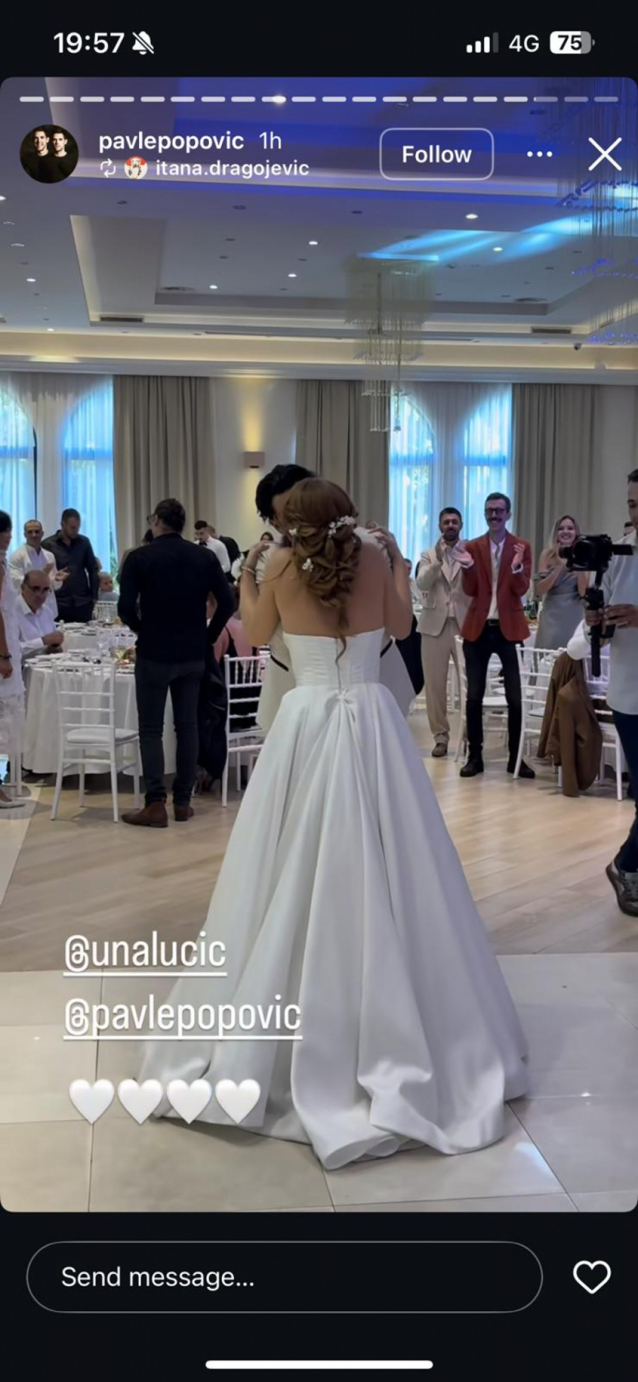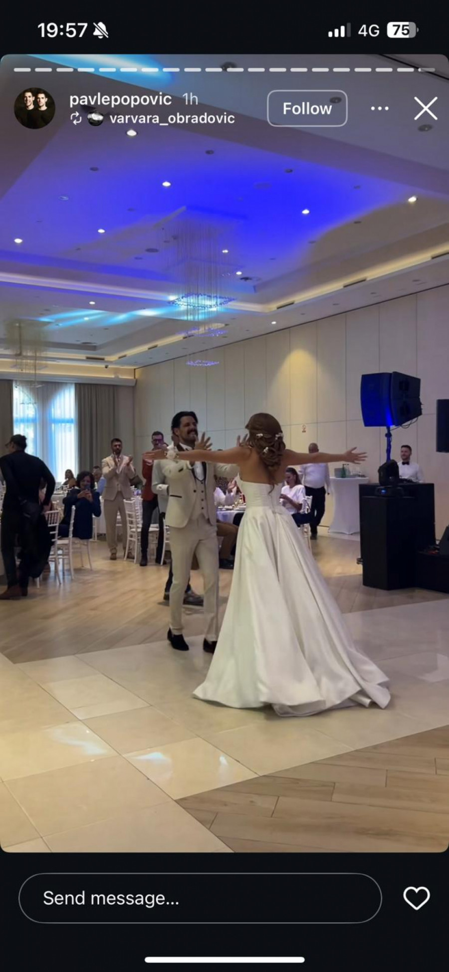 Mlada se pojavila u beloj venčanici i imala je opuštenu pletenicu ispod koje su se prepletali biseri, dok se Pavle odlučio za krem odelo, koje je po rubovima imalo crne detalje, a ceo stajling zaokružio je leptir mašnom.